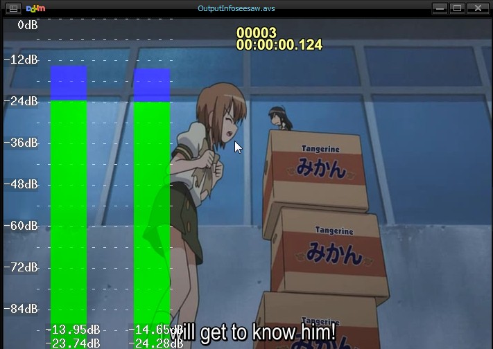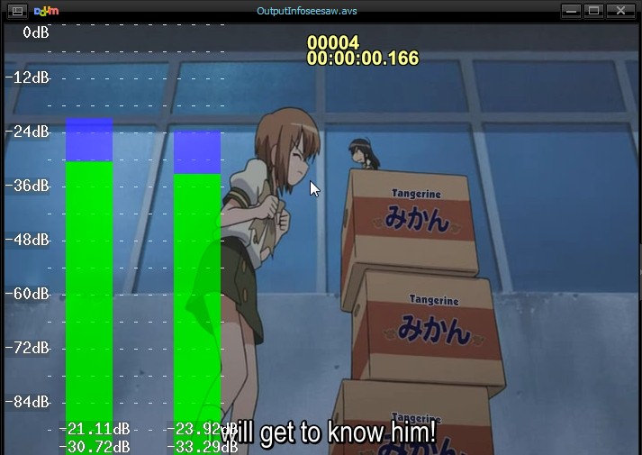 While I'm here, this is another little script that might come in handy for someone. All it does is display the audio levels over the top of the video. It's exactly the same as using Histogram("audiolevels") in a script that contains video, but if the source is "audio only" it'll create a blank clip to display the output meters.