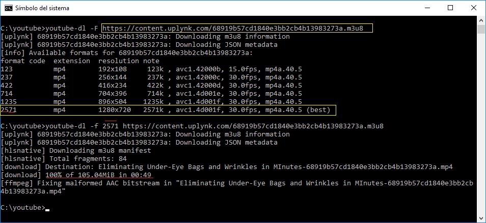 Code:youtube-dl "https://content.uplynk.com/68919b57cd1840e3bb2cb4b13983273a.m3u8"