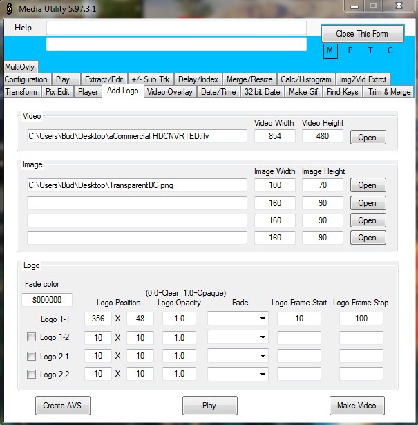 Creating video using ffmpeg.Code:v1 = Directshowsource("C:\Users\Bud\Desktop\aCommercial HDCNVRTED.flv").ConvertToRGB32.Lanczosresize(854, 480) img1 = ImageSource("C:\Users\Bud\Desktop\TransparentBG.png", pixel_type="RGB32", fps=23.976, end=100).converttoRGB32.LanczosResize(100,70) clip1 = v1.trim(0, -10) ++ v1.trim(10, -90).Overlay(img1, 356, 48,Opacity=1.0, img1.ShowAlpha()) \ ++ v1.trim(100, 0) return clip1