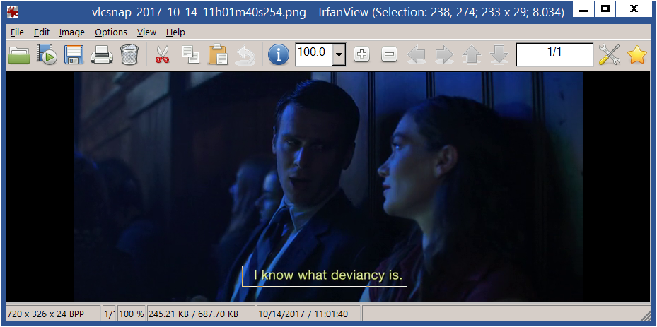here is below the snap i took of subtitle on movie in vlc, and placed it in Irfanview"c:\Program Files\ffmpeg-3.3.3-win64-static\bin\ffmpeg" -i %1 -vf delogo=x=495:y=428:w=303:h=109,2.780 -c:a aac -b:a 192k "%~dpn1.delogo.mkv"