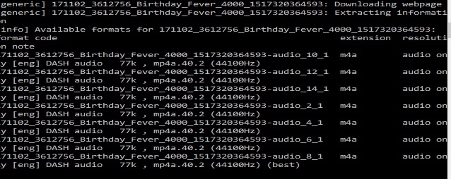 audio_8_1    m4a        audio only [eng] DASH audio   77k , m4a_dash container, mp4a.40.2 (44100Hz) (best)