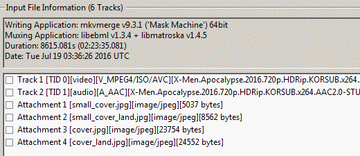 I also have tried to put the mkv file into handbrake, but handbrake also didn't show any file in the [subtitle] tab.Code:General Unique ID : 233059577852368640426903627413495449844 (0xAF55A458E178558689CE281D3B1B88F4) Complete name : K:\[Atraidez Data Center]\Film HD\04 najis audio video\X-Men - Apocalypse (2016) Hdrip Korsub\tai.mkv Format : Matroska Format version : Version 4 / Version 2 File size : 2.99 GiB Duration : 2 h 23 min Overall bit rate : 2 983 kb/s Movie name : X-Men.Apocalypse.2016.720p.HDRip.KORSUB.x264.AAC2.0-STUTTERSHIT Encoded date : UTC 2016-07-19 03:36:26 Writing application : mkvmerge v9.3.1 ('Mask Machine') 64bit Writing library : libebml v1.3.4 + libmatroska v1.4.5 Cover : Yes Attachments : small_cover.jpg / small_cover_land.jpg / cover.jpg / cover_land.jpg Video ID : 1 Format : AVC Format/Info : Advanced Video Codec Format profile : Baseline@L3.1 Format settings, CABAC : No Format settings, ReFrames : 1 frame Codec ID : V_MPEG4/ISO/AVC Duration : 2 h 23 min Width : 1 280 pixels Height : 720 pixels Display aspect ratio : 16:9 Frame rate mode : Constant Frame rate : 29.970 (29970/1000) FPS Color space : YUV Chroma subsampling : 4:2:0 Bit depth : 8 bits Scan type : Progressive Title : X-Men.Apocalypse.2016.720p.HDRip.KORSUB.x264.AAC2.0-STUTTERSHIT Language : English Default : Yes Forced : No Audio ID : 2 Format : AAC Format/Info : Advanced Audio Codec Format profile : LC Codec ID : A_AAC Duration : 2 h 23 min Channel(s) : 2 channels Channel positions : Front: L R Sampling rate : 44.1 kHz Frame rate : 43.066 FPS (1024 spf) Compression mode : Lossy Title : X-Men.Apocalypse.2016.720p.HDRip.KORSUB.x264.AAC2.0-STUTTERSHIT Language : English Default : Yes Forced : No