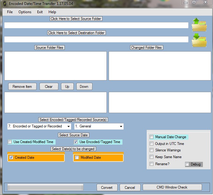 I did get the new version of the program to work. I think this is a very useful program for specific problems, but easier terminology needs to go into the labeling of the options. It's very confusing what needs to be marked. Here's the screenshot of the settings that retrieved the "encode date" of the file, and inserted it into the file name before the original filename, and also changed the modified/created date to match the encode date. Both the recent versions I had are pictured. Both produced the same result. "Select source date" is very confusing for the label, and "Change metadata date" makes you think you're changing the "encode" date if you check it. Thanks for your work though, I don't mean to be picky, it definitely works for what I wanted it to!!