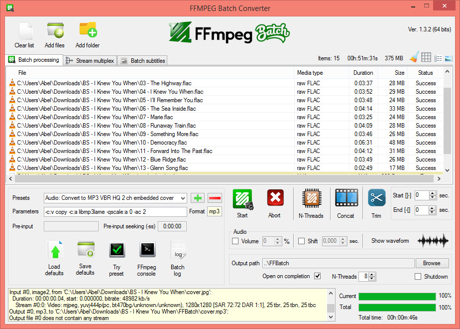 Hi, I've been using ffmpeg in Windows for many years, and I always missed the convenience of some graphical interface to have drag and drop, file listing, batch processing, progress bar, the typical windows application features. I searched for something simple, because my operations are usually just stream copy to .mp4, .ts, convert to mp3, flac 16/44,1, convert video audio tracks to aac 2 channels, trimming, concatenating, also some video shrinking and resizing.