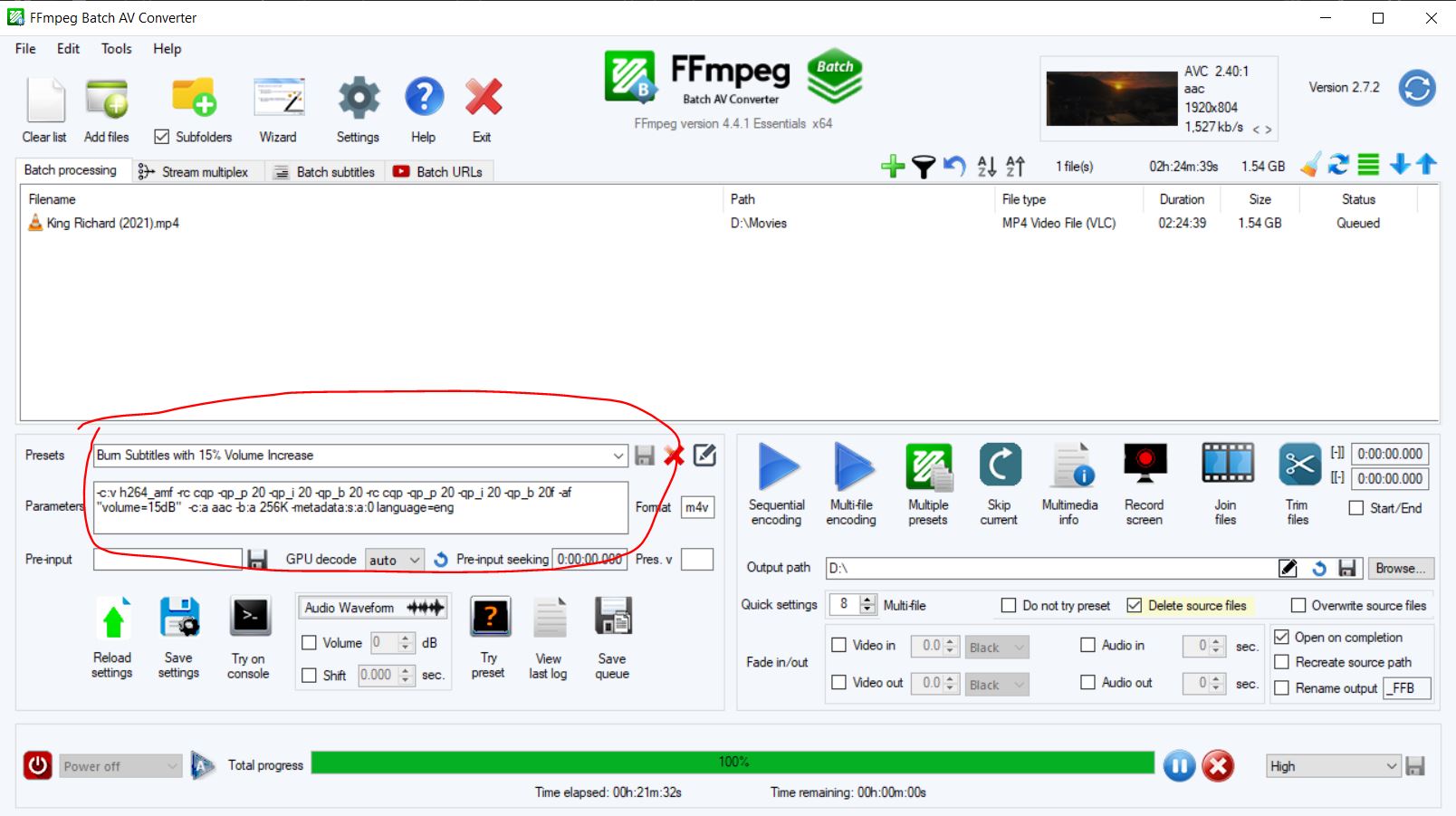 One error you may encounter with this is, is if your source video has "dvd" type subtitles. It will error immediately. A workaround for this is to remove -map 0 from the parameters. You will end up with a file that contains just video and audio. You can then copy the subtitles tracks into that folder later (I do this part manually in the command line using ffmpeg.exe)