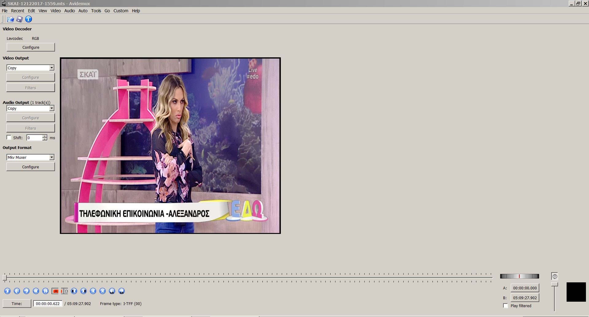 For example i record my tv using a usb stick. The tv produces an mts file. When i record the 1080i version of the channel the file works ok with avidemux. But when i record the 576i version the file takes forever to be loaded while avidemux appears to not be responding. Also the 16/9 ratio becomes 4/3 and is exported as such. I have to stretch it in my player to view it properly.