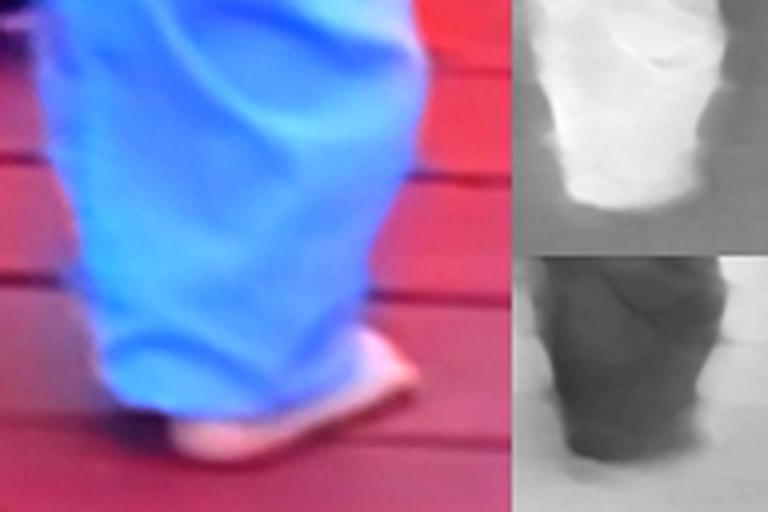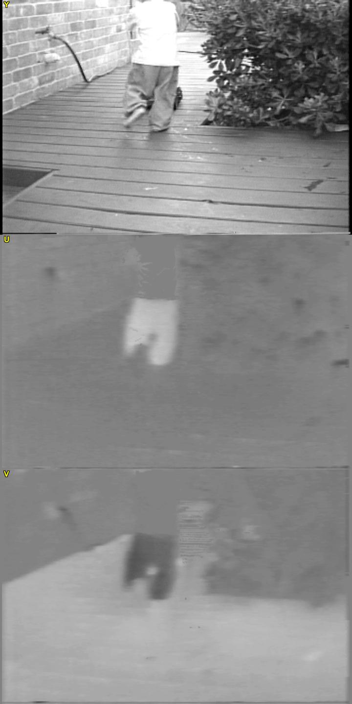 Some of the bricks are red-ish but that's not color bleeding. Later in the clip there's a round red object on the table in the background. Notice how the red color sloughs off to the right of the object -- that's color bleeding. You can also see it to the right of the blue jeans against the red porch. Consumer analog video tape has very low color resolution. You always get color bleeding like this. Here's a image of the Y (greyscale), U and V (color) channels: