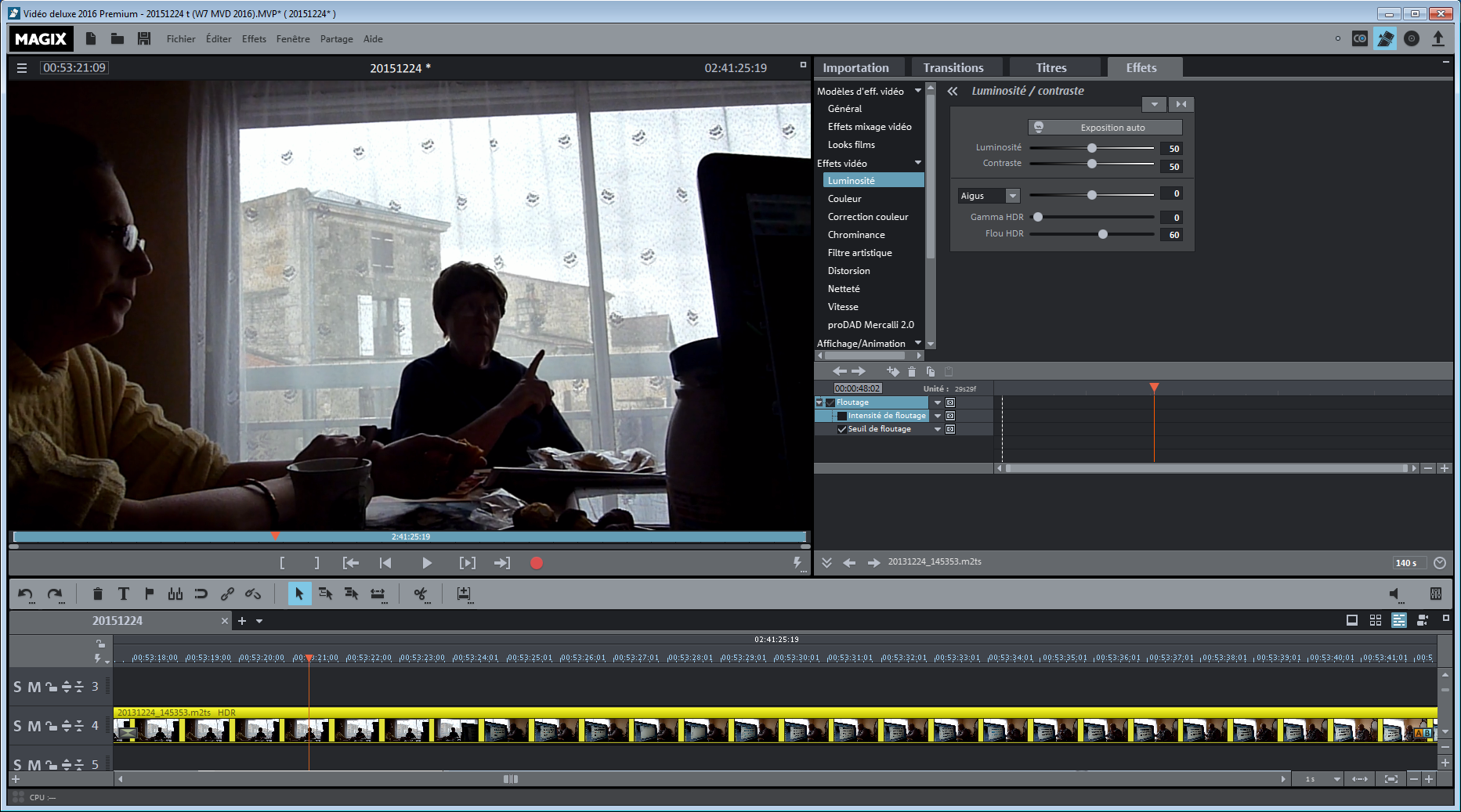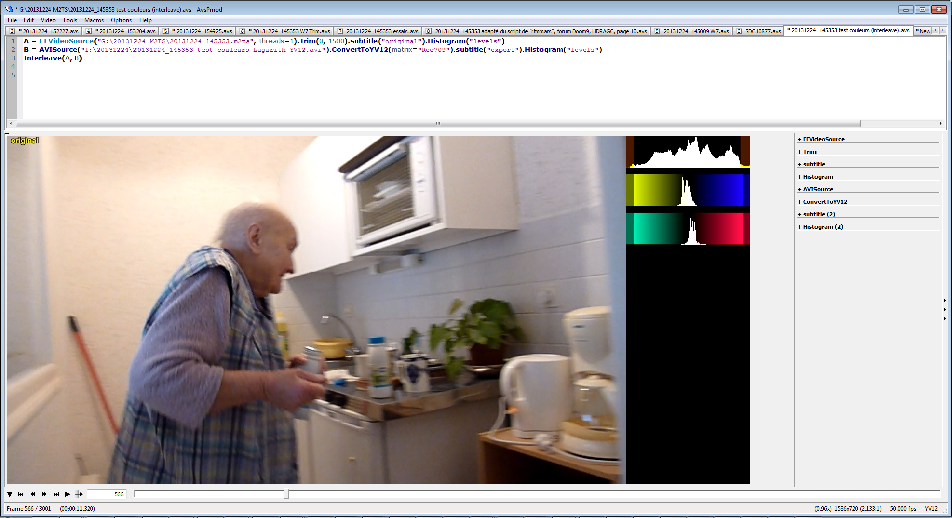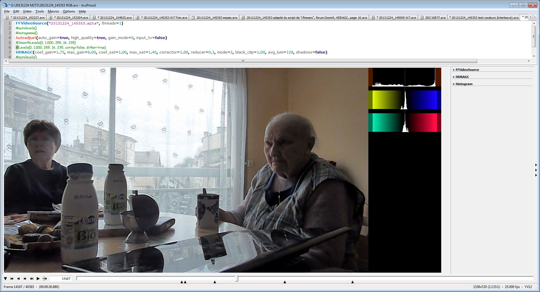 Even with my new machine based on an i7 6700K with 16GB or RAM, this proves to be too much for a fluid real-time playback (as a matter of fact the framerate for exporting those scripts to AVI files with VirtualDub is about 15fps), mainly I guess because of the denoising filter. Is it enough to explain that kind of issue ? Or is it a known problem that AVFS can't be trusted to provide a perfectly reliable replacement for lossless intermediate files ? Or could it be related to FFVideoSource having trouble with random frame access, as opposed to processing a video stream from start to finish ? Or is it the fact that some of those script calculate the effect on a given frame by averaging statistics from surrounding frames ?Code:FFVideoSource("20131224_145353.m2ts", threads=1) Autoadjust(auto_gain=true, high_quality=true, gain_mode=0, input_tv=false) HDRAGC(coef_gain=1.75, max_gain=6.00, coef_sat=1.00, max_sat=1.40, corrector=1.00, reducer=0.3, mode=2, black_clip=1.00, avg_lum=128, shadows=false) SMDegrain(thSAD=200)