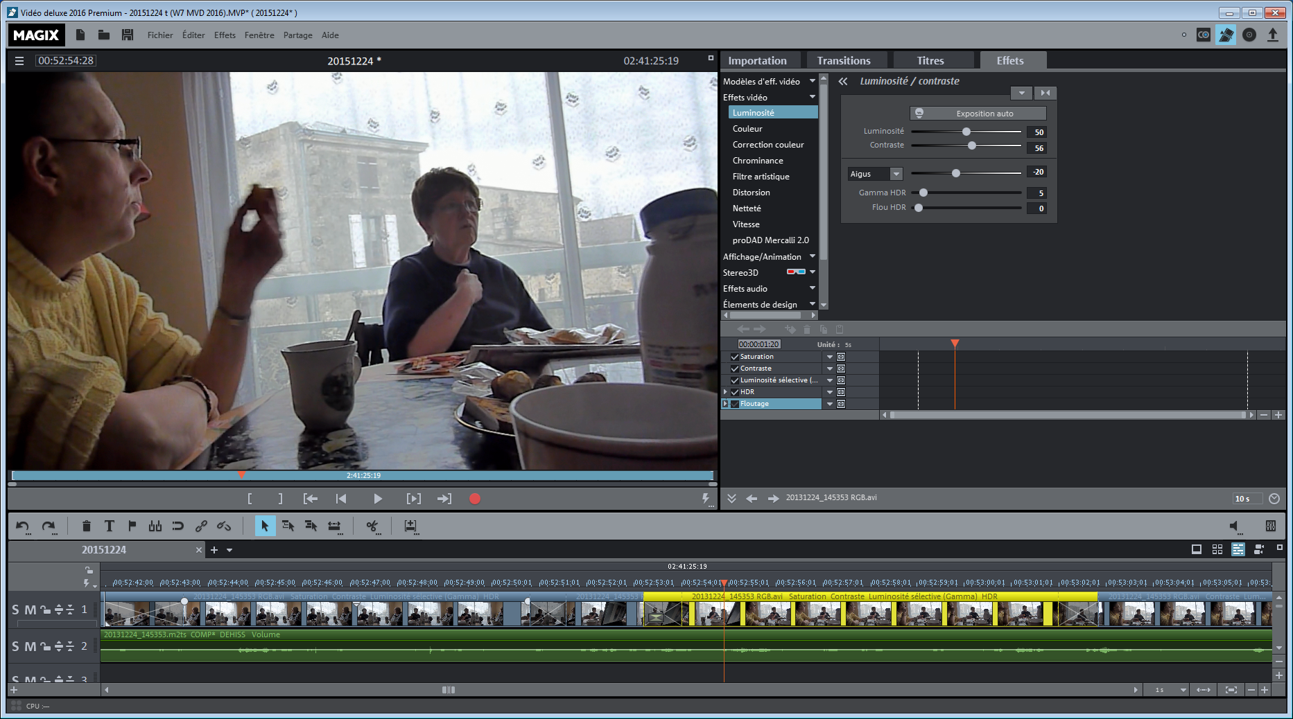 I tried to fiddle with the luma curve mainly : it's relatively easy to get a dramatic improvement very quickly, with the help of the histogram (that part at least is way more intuitive and practical than adjusting contrast or gamma values, without knowing exactly what it does and how those adjustments interact with eachother). Beyond that, indeed, it would require a lot of time just to get acquainted with the notions you mentioned, I've spent way too much on this already. And there are some frustrating aspects : export formats are limited in AVI (only Cineform and uncompressed are available, can't use the lossless encoders installed on the system – otherwise there's a tremendously rich choice of uncompressed formats in 10bits+, of no use here), exporting to MP4 / H.264 gives an error with no explanation (“Recording failed with error : failed to encode video frame”), and apparently the only available framerates are 23.976, 24, and “30 (3:2)”, while my footage is 25fps and the finished movie will be 29.970 (because the first half was shot at that rate – I was advised to export in 59.94 for a smoother playback of the 25fps part, but I don't have this option in MVD). I still tried to export the longest of those videos (26m54s) to uncompressed 8bit, after a quick-and-dirty treatment based on a single frame which I thought would be representative of the worst-looking parts, I got a 70GB file (MediaInfo recognizes it as “HDYC”), with muted audio (don't know why, the audio is silent within the timeline too), but a correct 25fps framerate (when choosing “Individual clips” rather than “Single clip” the framerate option disappears so it probably keeps the native value). I also tried exporting in MOV / MPEG4 Video, with “Best” quality setting : it works, but the output has a constant bitrate around 5000kbps, less than the native files (~8000kbps), it's probably not enough to produce a visually transparent output. Then, checking the whole video, some parts are better looking than their HDRAGC counterparts, better colors, more natural contrast it would seem, others are worse – but it's possibly because I let the “Data levels” option to “Auto”, and apparently the export was made in full range (for the MOV export I chose “Video” and it looks better). I think that I'm going to export those roughly treated files, and mix them with the Avisynth-treated ones, by checking them both section by section and keeping what looks best.