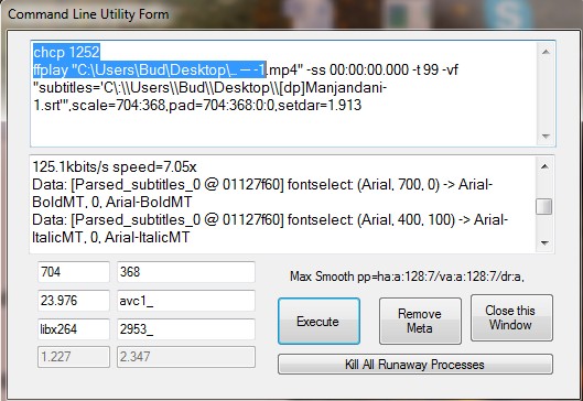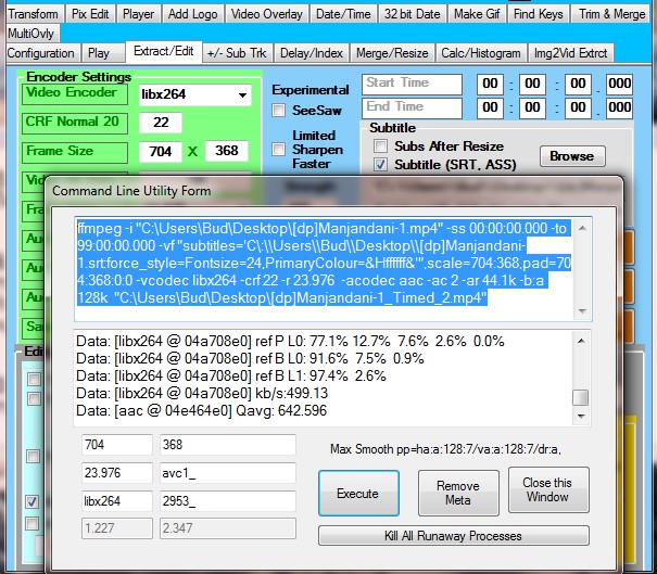 Code:ffmpeg -i "C:\Users\Bud\Desktop\[dp]Manjandani-1.mp4" -ss 00:00:00.000 -to 99:00:00.000 -vf "subtitles='C\:\\Users\\Bud\\Desktop\\[dp]Manjandani-1.srt:force_style=Fontsize=24,PrimaryColour=&Hffffff&'",scale=704:368,pad=704:368:0:0 -vcodec libx264 -crf 22 -r 23.976 -acodec aac -ac 2 -ar 44.1k -b:a 128k "C:\Users\Bud\Desktop\[dp]Manjandani-1_Timed_2.mp4"