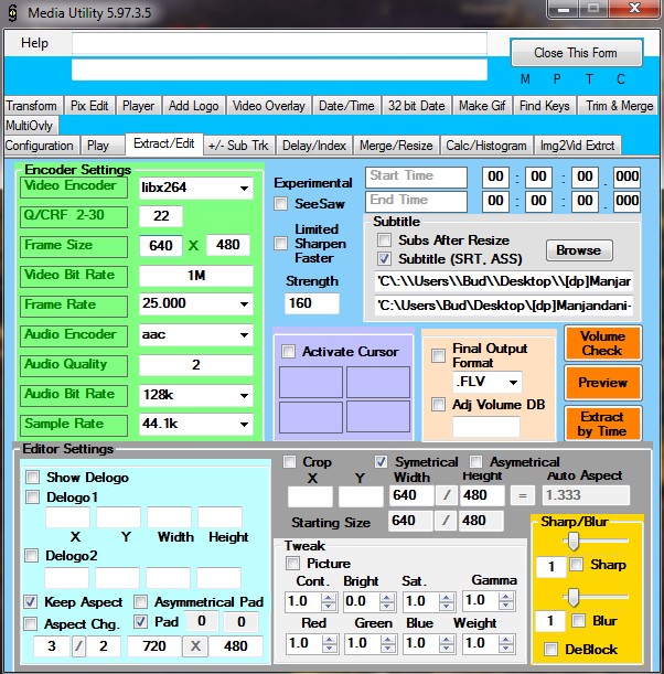 I used the Image2Vid tab to create a 10 second video of my Avatar image. Then added the subtitles to the video with the Extract/Edit tab and hit 'Extract by Time' and it created the correct FFMPEG string which I can view, change or execute to make sure it works and that new versions of FFMPEG work as correctly as when I wrote the program.