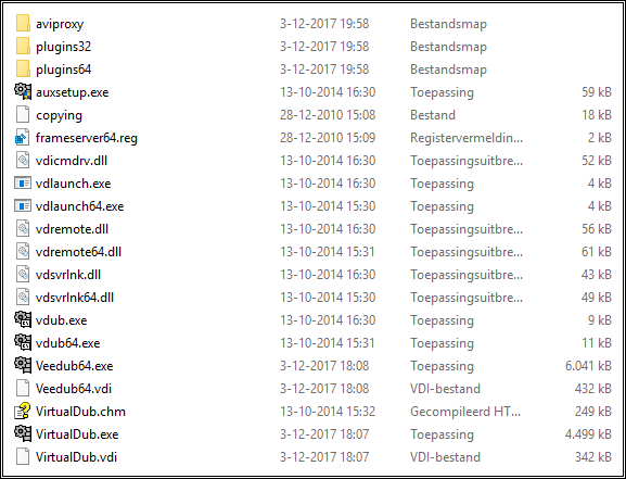 These are the files and folder of VirtualDub FilterMOD. For 32bit Windows I assume you can delete the folder "plugins64" and the files "vdub64.exe", "VeeDub64.exe"and "VeeDub64.vdi". I assume as well you can delete the folder "plugin32" and the files "vdub.exe", "VirtualDub.exe" and "VirtualDub.vdi".