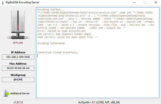 1) The distributed encoding works great but noticed that once in a while the "Server 2" machine would randomly disconnect with a socket error 10054 "Connection Reset by Peer". Any hints as to why that is happening? When I click the online button it reconnects without any issue until it does it again at some point.