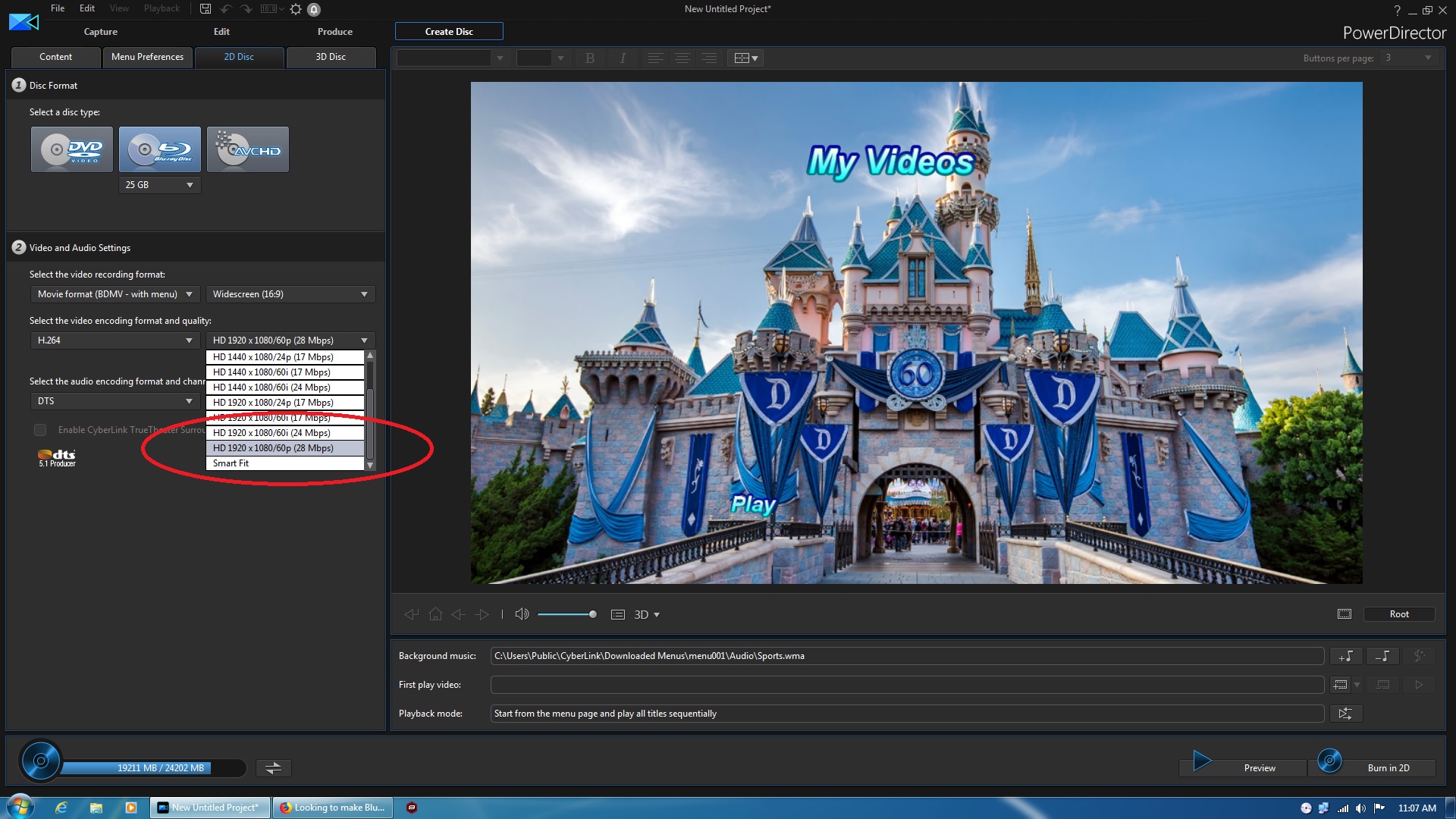 For the record: PowerDirector's 1080p60 blurays will hold 90 minutes of video on a 25GB bluray with menus. That's using 1080p60 source video that contains 5.1 audio. The 1080p60 blurays include that 5.1 audio in DTS 5.1. These 1080p60 blurays bounce around during playback between 26 and 35Mbps depending on detail of subject. Most all modern bluray players support playback speeds up to 40Mbps.