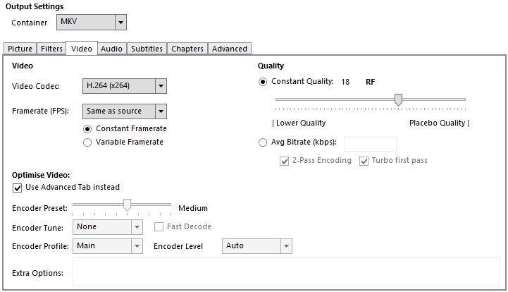 Originally I was going to go with a Constant Quality Rate Factor of 16, but after doing some tests I decided to settle on 18 because I couldn't see a difference in quality. Any reason I should be going back to 16? Any settings I could change to further increase quality or reduce file size without encoding time getting really out of hand?
