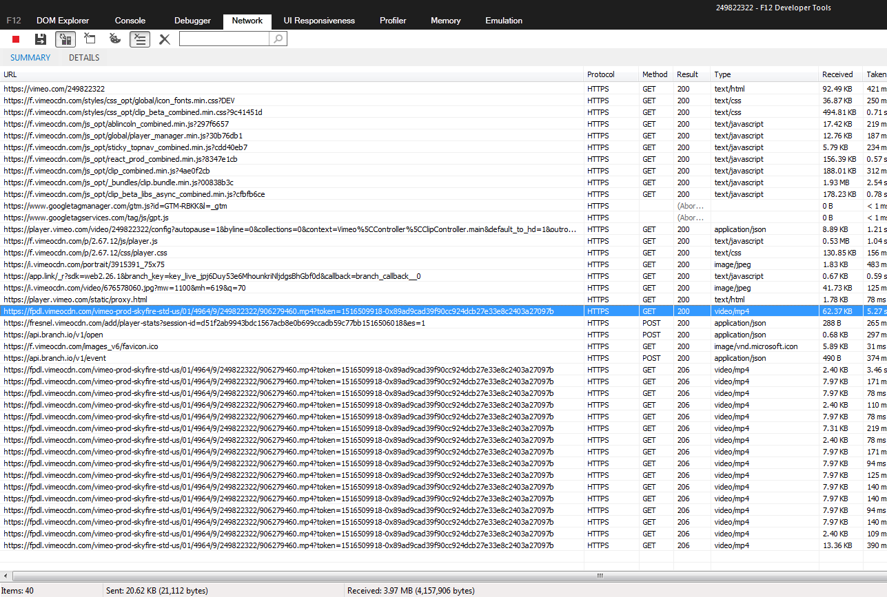 I'm trying to find links to Vimeo's videos thru the "Developer tools" from firefox, but i just found small parts from the videos. Well.. I wanna' know how to find the complete link from the below video.