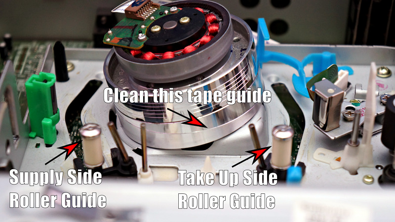 2. Bellow the upper cylinder there is a tape guide that you have to clean up with a tooth pick or another soft but hard material like a bamboo material with a sharp edge like a screwdriver to remove any dirth that can damage the tape, same to all rollers and guides.
