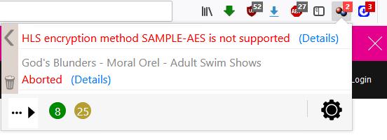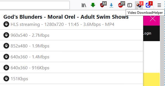 I was able to download the best 480p file of medium quality. But the main problem is it's not in HD 720p format. If you look at one of the pictures I posted above, my VideoDownloadHelper add-on offered me a 720p resolution download. It seems the 720p download isn't available with TVDownloader or YouTube-dl either.Code:youtube-dl http://www.adultswim.com/videos/moral-orel/gods-blunders --ap-mso=Comcast_SSO --ap-username=XFINITYUSERNAME --ap-password=XFINITYPASSWORD