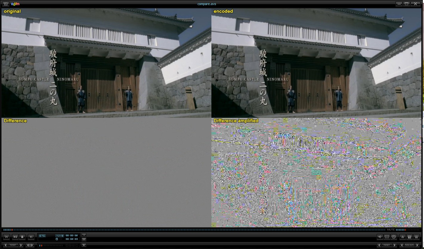 And then inspect the video as it plays:Code:v1=directshowsource("C:\PathToVideo\[dp]Manjandani-1.mp4", audio=false).ConvertToYV12() v2=directshowsource("C:\PathToVideo\[dp]Manjandani-1_2.mp4", audio=false).ConvertToYV12() sub = v1.subtract(v2) substrong = sub.levels (122,1,132,0,255) StackVertical (StackHorizontal (v1.subtitle ("original"),v2.subtitle("encoded")), StackHorizontal(sub.subtitle("Difference"),substrong.subtitle("Difference amplified")))