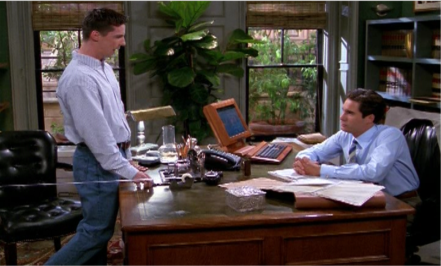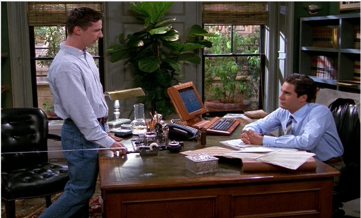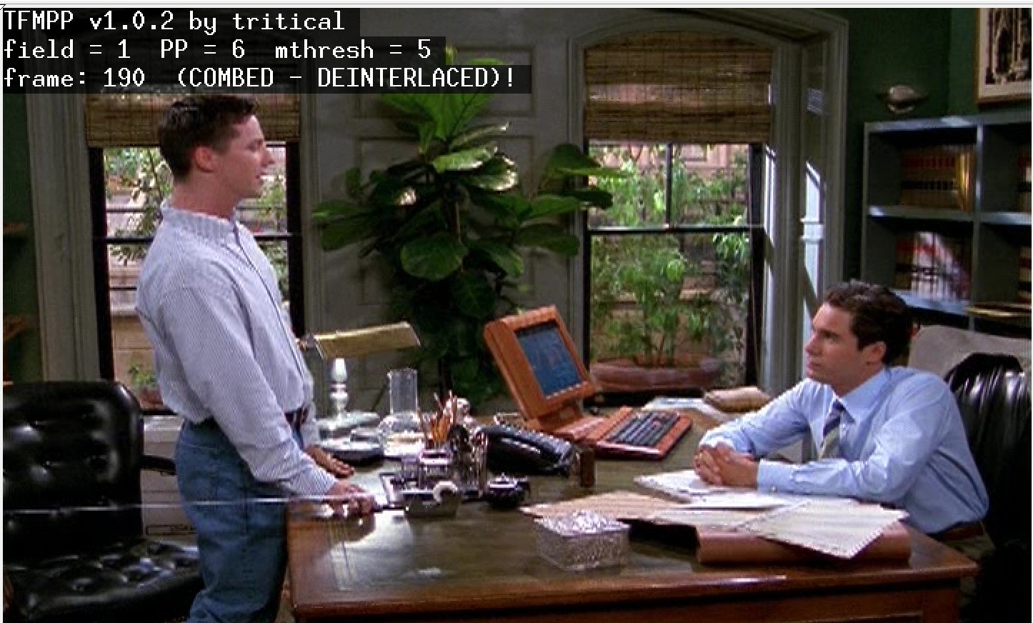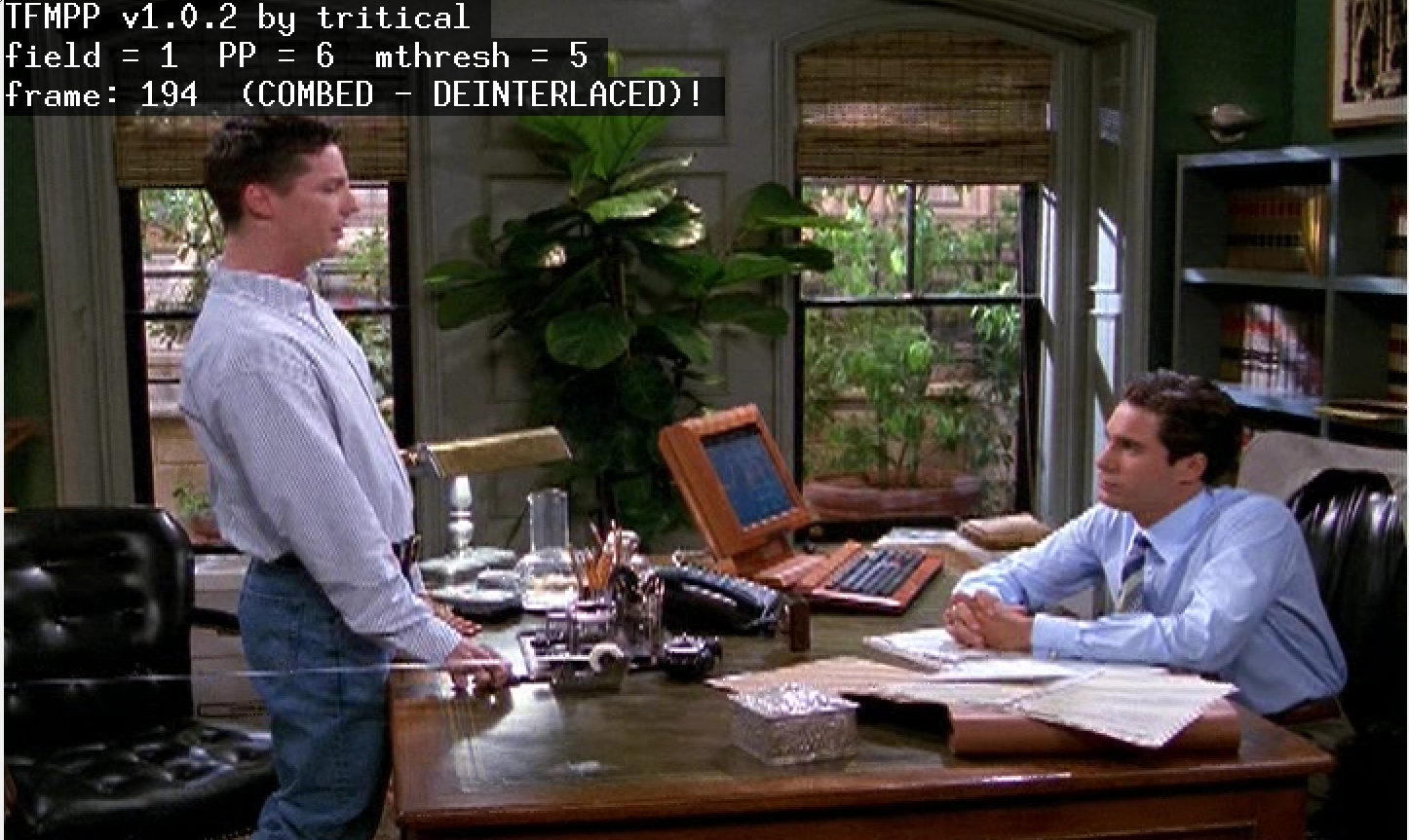 Notice the white line that stretches from the table past the leather chair. It might be a good indicator of interlacing. It is a piece of long tape that's part of the scene. Whenever the tape looks jagged (as well as the table line mentioned in the above post), the frame would display the message "combed - deinterlaced.' Whenever it says "Clean" frame, that piece of tape or the table would be a straight line.