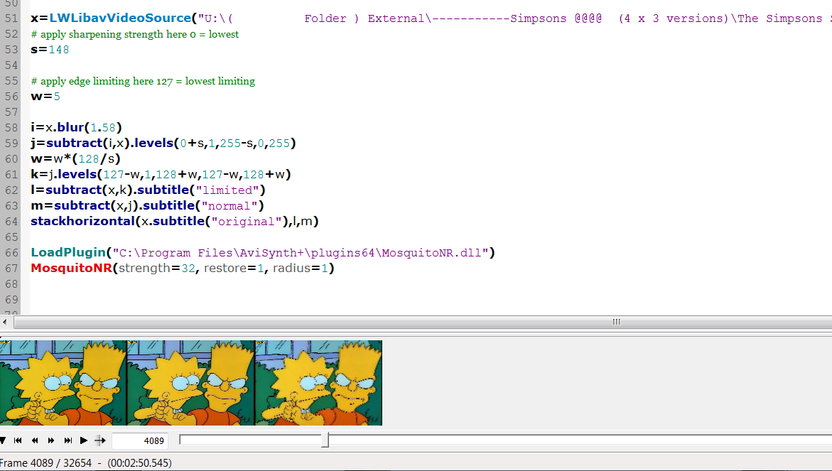Code:x=xxxsource("blabla.xxx") # apply sharpening strength here 0 = lowest s=48 # apply edge limiting here 127 = lowest limiting w=5 i=x.blur(1.58) j=subtract(i,x).levels(0+s,1,255-s,0,255) w=w*(128/s) k=j.levels(127-w,1,128+w,127-w,128+w) l=subtract(x,k).subtitle("limited") m=subtract(x,j).subtitle("normal") stackhorizontal(x.subtitle("original"),l,m)