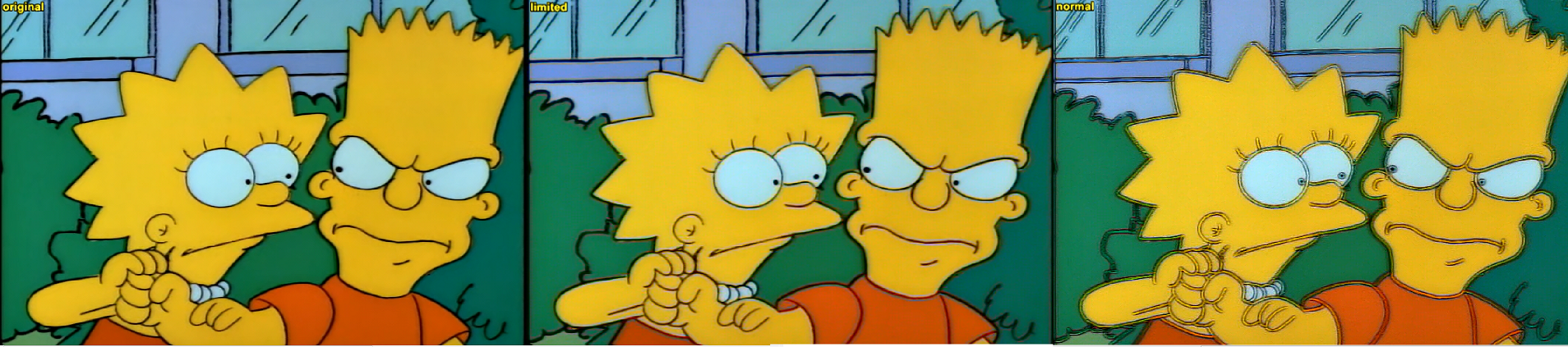 Code:Function simplesharpen(clip c, int "s", int "w") { s = default ( s, 48 ) w = default ( w, 5 ) x=c # apply sharpening strength here 0 = lowest s=48 # apply edge limiting here 127 = lowest limiting w=5 i=x.blur(1.58) j=subtract(i,x).levels(0+s,1,255-s,0,255) w=w*(128/s) k=j.levels(127-w,1,128+w,127-w,128+w) l=subtract(x,k).subtitle("limited") m=subtract(x,j).subtitle("TEST") stackhorizontal(x.subtitle("original"),l,m) output=m return output }Last edited by strawberryshortcake; 14th May 2018 at 04:54.