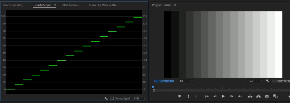 There is another caveat: with the stairstep signal, the top and bottom steps get lost in the window borders, so it is necessary to expand the window vertically or maximize it to see those steps.Code:bin\ffmpeg -y -r 24 -i stairstep.bmp -crf 17 -c:v libx264 -vf scale=out_range=pc,format=yuv420p -x264opts colorprim=bt709:transfer=bt709:colormatrix=bt709:fullrange=on -an fullrange.mp4