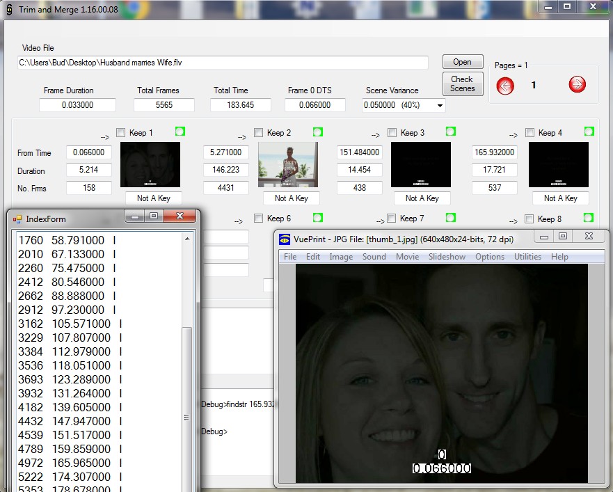 Yes, I have a version I use for my own use as I perfect it. I can upload a version but it still has a ways to go. I have added features to try to handle the items I listed as problems above. It has a Manual mode in case your scene is not on a key frame or the scene is not found but you know approximately where it is. The scenes below are during actual use and I blanked some image because I sometimes use adult material, although not that bad, because they are absolutely the WORST in errors, play-ability, seek, mediainfo errors, etc. and they are easy to determine which frame is which. They have often been cut and merged unsuccessfully many time which makes for a good test subject if not subject material.