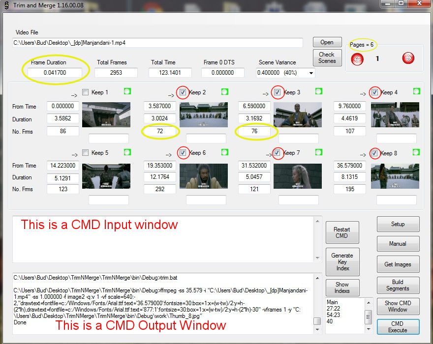 In the image below you will see the circled items show the frame rate to be about 24 FPS (.041667 duration.), There are 6 pages of 8 scene changes (48 in all) shown at top right. The scene changes occur so fast that notice the circled 'NbrFrms' (Number of frames in the scene) is low at 86, 72, an 76. That's about 3 seconds each. (86/24FPS, 72/24FPS, 76/24FPS). My wishes for this video is to eliminate the opening (KEEP 1) so I unchecked it. This means the first scene change will not be saved (A to B so to speak). The next 3 scenes are all part of the same scene and I want to keep together as one video so I checked KEEP 2/3/4 boxes. Being contiguous they will be saved as one complete video.