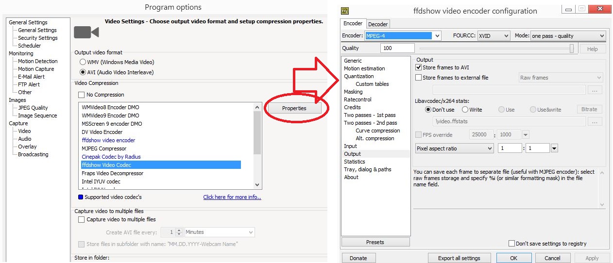 The codec that is selected by default is ffdshow video codec, screenshots of the properties of which is also attached above.