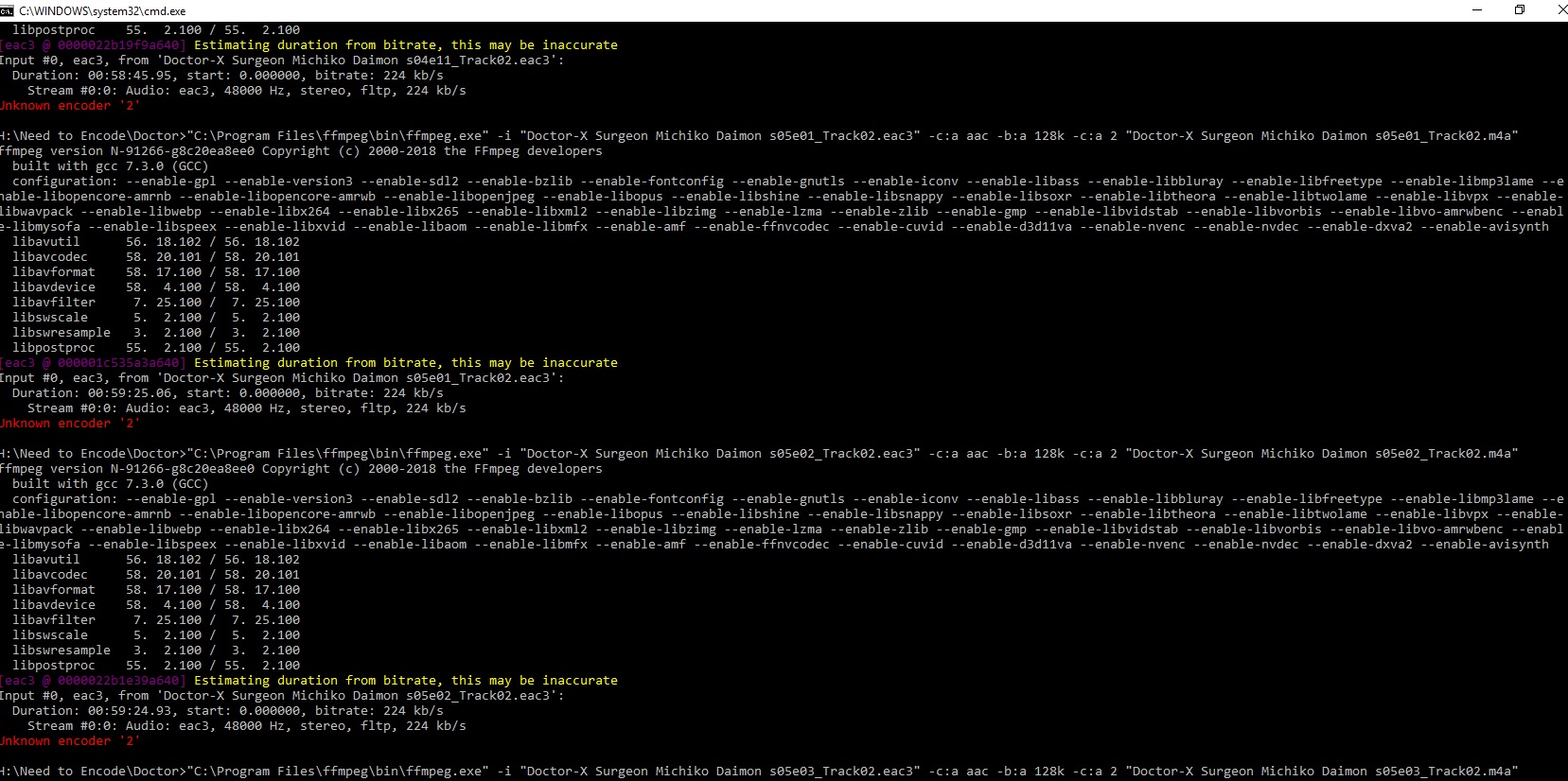 andCode:pushd H:\Need to Encode\Doctor for %%a in (*.eac3) do "C:\Program Files\ffmpeg\bin\ffmpeg.exe" -i "%%~a" -c:a aac -b:a 128k -c:a 2 "%%~na.m4a"