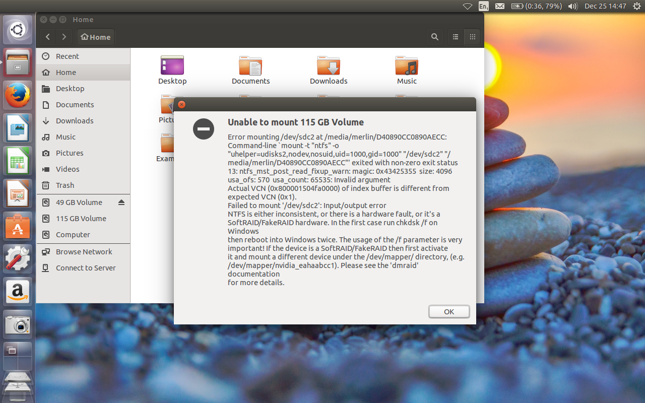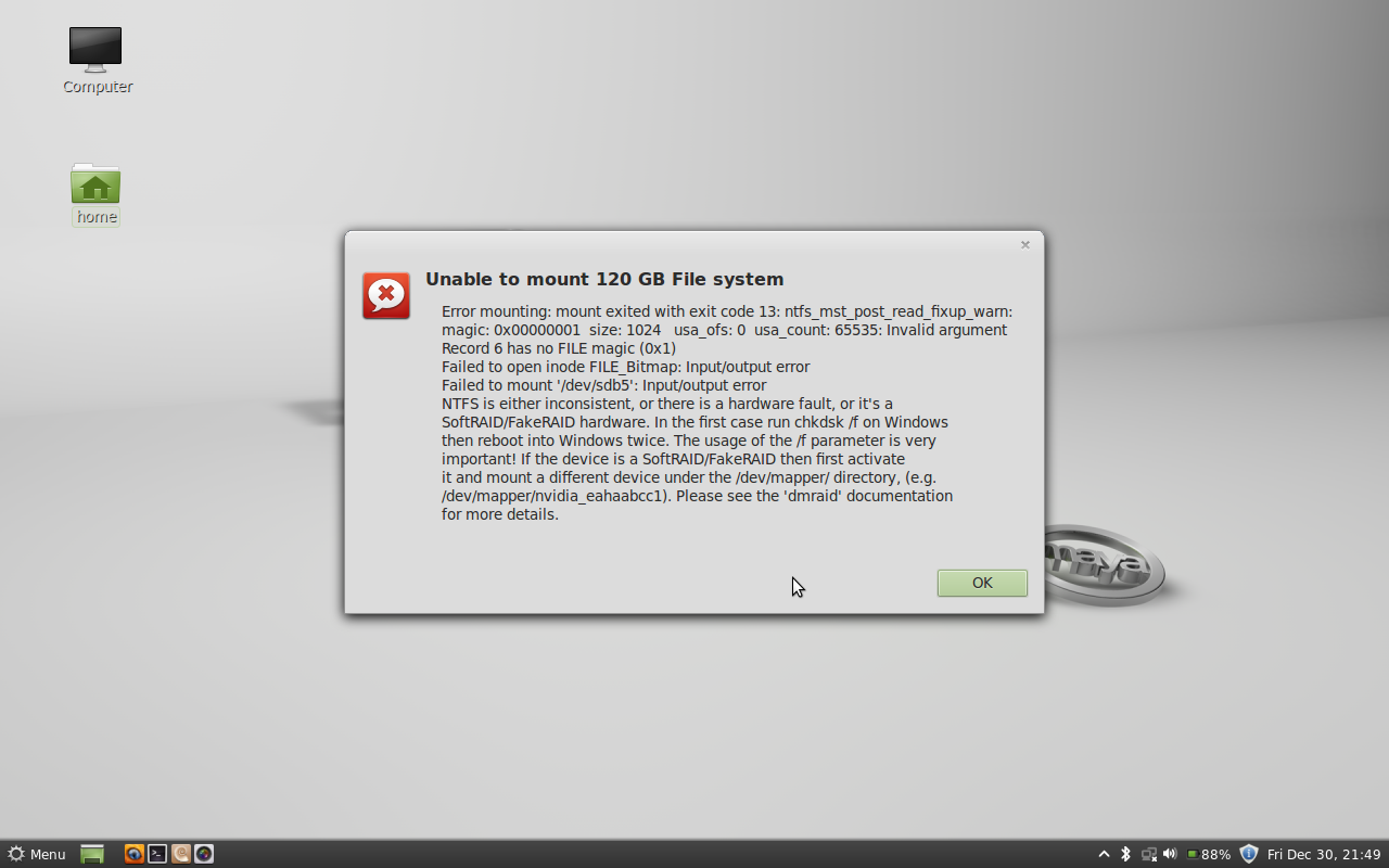 I also tried to access with Linux Mint with same result and dialog box. This HDD has mostly MOV video files on it, and a day previous to inserting the usb caddy I had installed Openshot and Avidemux on Ubuntu (if that is relevant )? I am using a 1.8 dual core laptop .Any help with this matter welcomed as the HDD have been left to the side until I find someone who has overcome the same problem. Many thanks, Cheers.