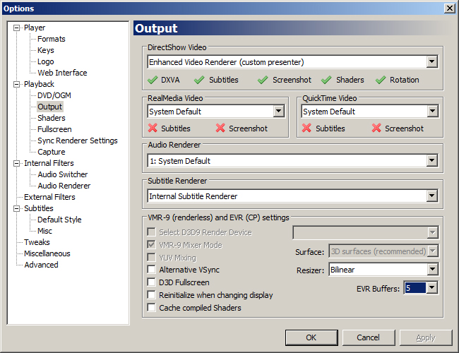 AS for Buffers there is a section says VMR-9 (renderless) and EVR (CP) settings and in there is EVR Buffers 5 and if I click it there is a great long list of numbers to choose from.