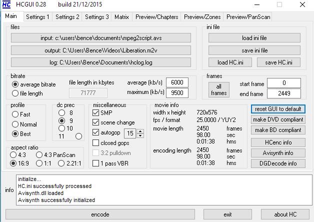 Then use any MPEG 2 encoder that supports AviSynth scripts. Like HCGui (it's a good encoder and it's free).Code:LWLibavVideoSource("00121_new.ts") AssumeFPS(25) ColorYUV(gain_y=-25) # a little darker ColorMatrix(mode="rec.709->rec.601") # HD colors to SD colors BilinearResize(720,576) # softer resize -