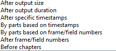 you can also try Mkvtoolnix. Resulting in 2 or more mkv files. It is lossless too. But cutting on keyframes only. Mkv files can then be converted to different container. When in copy mode, it is also lossless. It is if I recall it precisely on second tab. Lots of way to cut. Timestamps, frames etc. Cca. 8 ways.