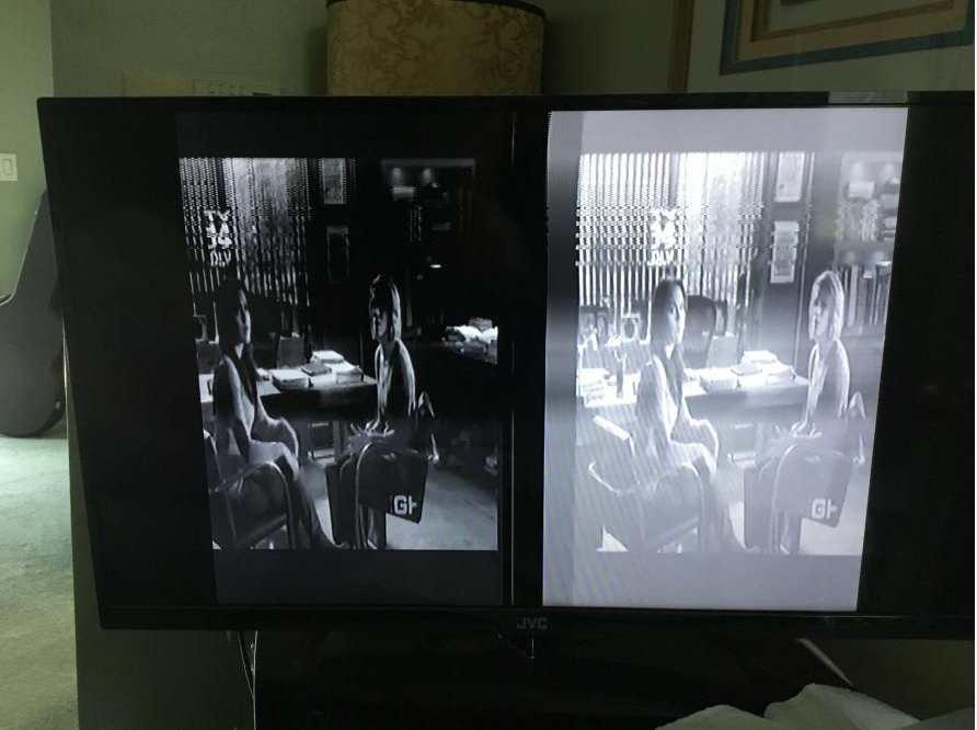 I’m new to the forum. Glad to be here. I was given a Panasonic DMR-ES40V VHS/DVD recorder recently and am having an issue with it. When I turn it on, the interface screen is black and white with a black bar down the center, and the image is repeated on both sides of the screen. This also occurs during VHS and DVD-r playback. Please see photos: