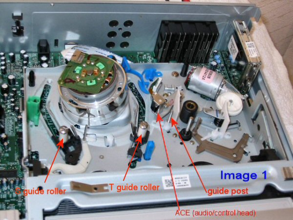 It's labeled "ACE" in this photo. A smooth vertical piece that the tape rides against. Be careful while you are working there not to touch any part of nearby video drum. The control/audio head may need to be demagnetized as well as cleaned.
