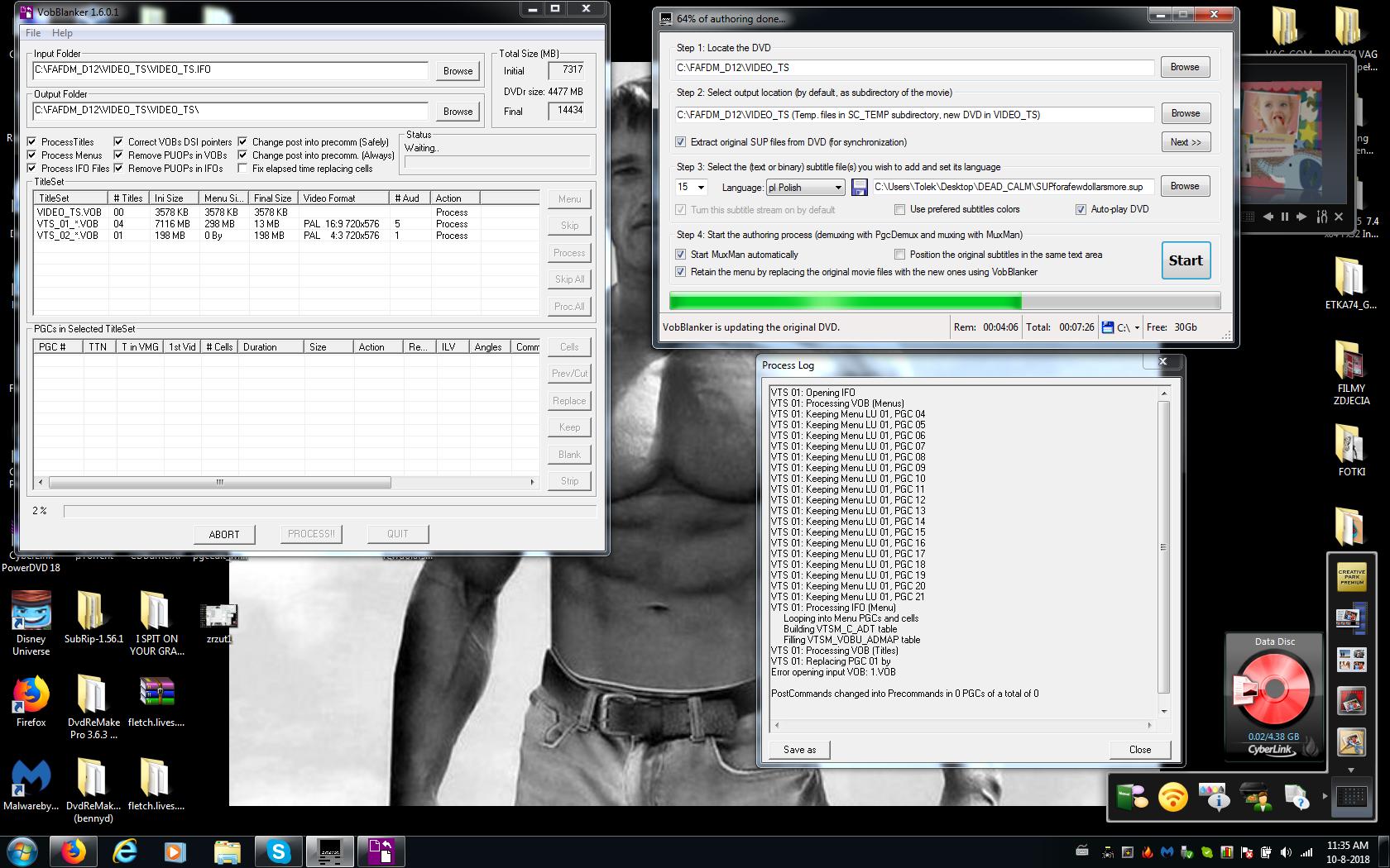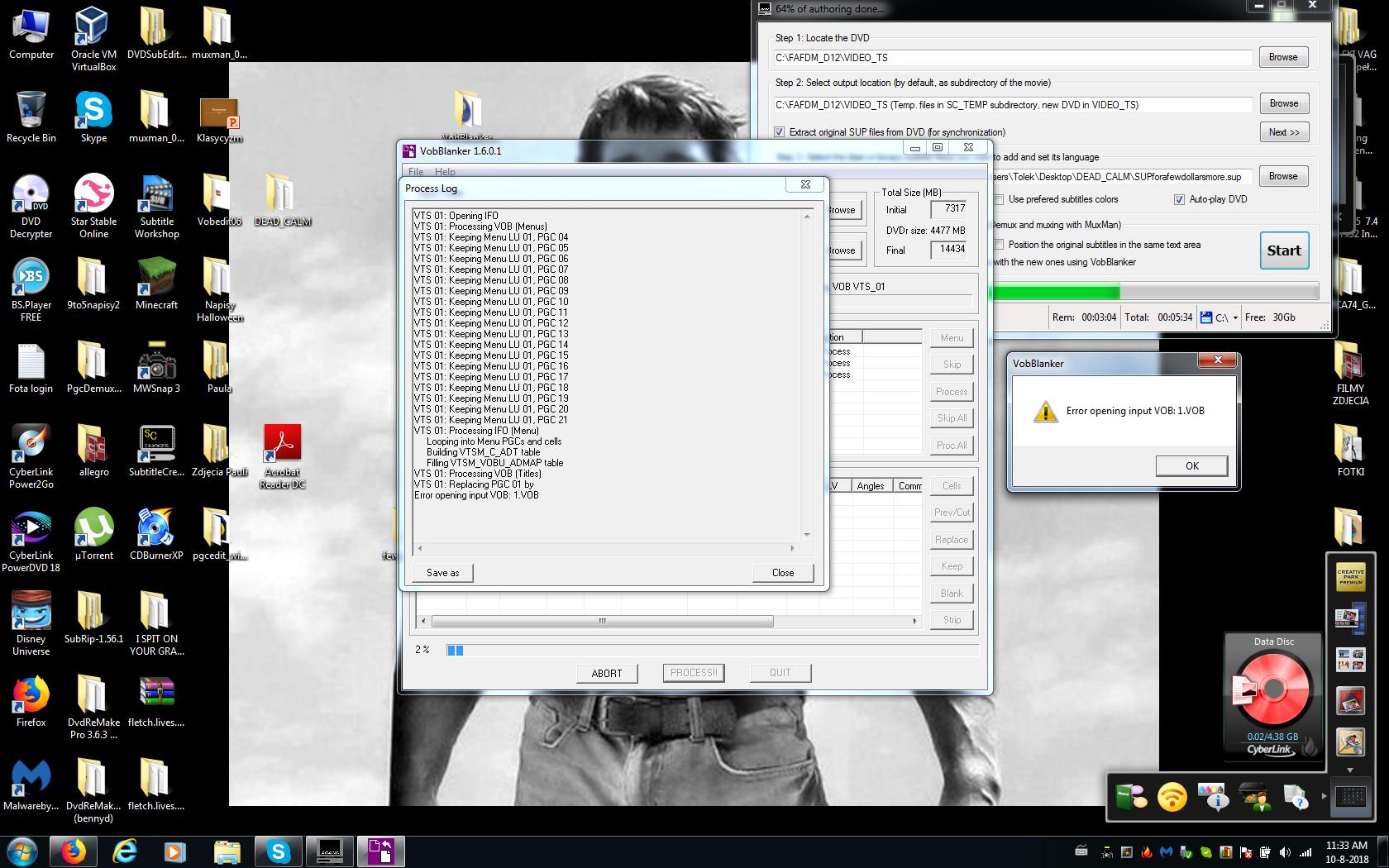 While authoring dvd , Subtitle Creator works well with Pgc edit and Muxman, finally VobBlanker is enabled and error message open Vob is displayed. /error open Vob/ Why VobBlanker can not open the vob file, is it badly tied to the hard disk? Did you have such a case? It happens me not on every DVD movie.