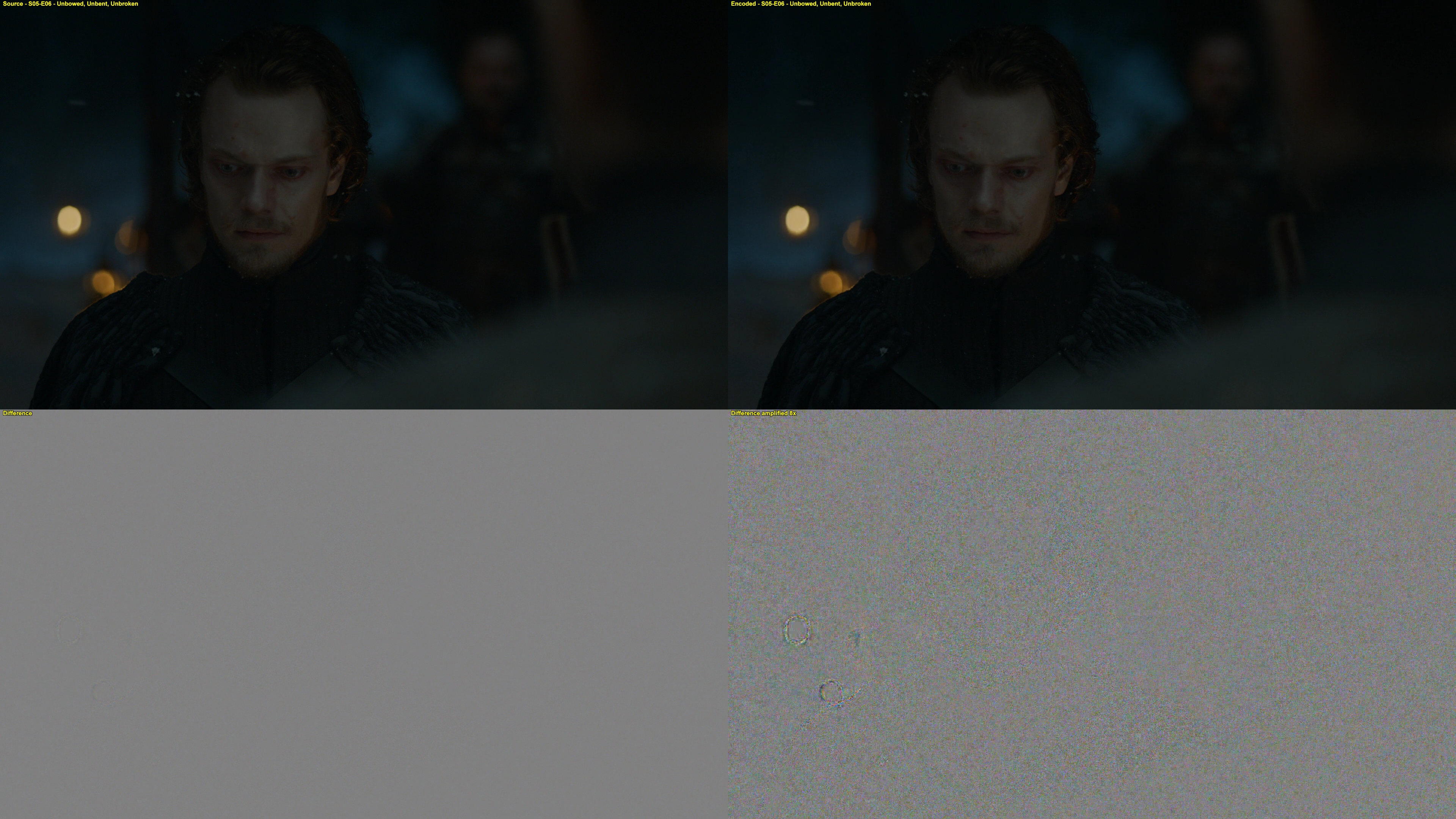 I thought the labels in each photo should be self-explanatory; both source and encoded versions, difference and difference amplified.