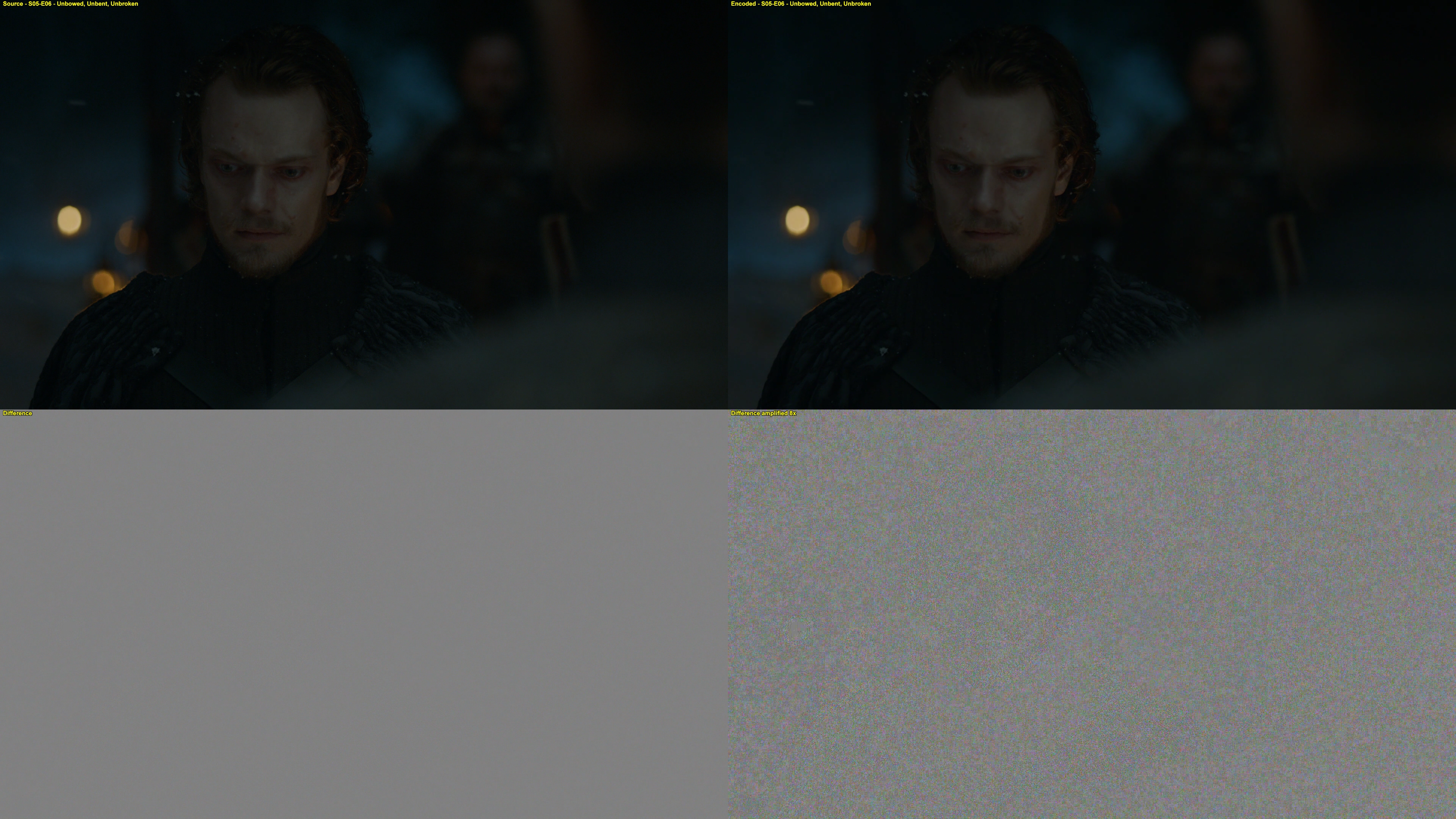 If you wanted to, you can use FFInfo() to get info on , the type of frame (I,B,P) for your analysis . The info can be helpful for comparisions maybe tweaking settings (where is an encoder weak, maybe some I:P:B ratio and/orquantizer can be adjusted, maybe more or fewer B-frames , etc...)Code:q=FFVideoSource("S05-E06 - Unbowed, Unbent, Unbroken.mkv").hdragc().subtitle("quicksync") x=FFVideoSource("S05-E06 - Unbowed, Unbent, Unbroken x264-19.9.mkv").hdragc().subtitle("x264") interleave(q,x) -