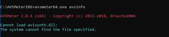 Code:C:\AVSMeter286>avsmeter64.exe avsinfo AVSMeter 2.8.6 (x64) - Copyright (c) 2012-2018, Groucho2004 Cannot load avisynth.dll: The system cannot find the file specified. C:\AVSMeter286>avsmeter.exe avsinfo AVSMeter 2.8.6 (x86) - Copyright (c) 2012-2018, Groucho2004 VersionString: AviSynth 2.60, build:Mar 31 2015 [16:38:54] VersionNumber: 2.60 File / Product version: 2.6.0.6 / 2.6.0.6 Interface Version: 5 Multi-threading support: No Avisynth.dll location: C:\Windows\SysWOW64\avisynth.dll Avisynth.dll time stamp: 2015-03-31, 06:40:58 (UTC) PluginDir2_5 (HKLM, x86): C:\Program Files (x86)\AviSynth\plugins [C 2.5 Plugins (32 Bit)] C:\Program Files (x86)\AviSynth\plugins\yadif.dll [1.7.0.0] [CPP 2.5 Plugins (32 Bit)] C:\Program Files (x86)\AviSynth\plugins\ChromaShift.dll [2018-10-05] C:\Program Files (x86)\AviSynth\plugins\EEDI2.dll [0.9.2.0] C:\Program Files (x86)\AviSynth\plugins\nnedi.dll [1.3.0.0] C:\Program Files (x86)\AviSynth\plugins\nnedi2.dll [1.6.0.0] C:\Program Files (x86)\AviSynth\plugins\SSE2Tools.dll [2018-10-07] [CPP 2.6 Plugins (32 Bit)] C:\Program Files (x86)\AviSynth\plugins\AddGrainC.dll [1.5.2.0] C:\Program Files (x86)\AviSynth\plugins\DePan.dll [2.13.1.3] C:\Program Files (x86)\AviSynth\plugins\DePanEstimate.dll [2.10.0.2] C:\Program Files (x86)\AviSynth\plugins\dfttest.dll [1.8.0.0] C:\Program Files (x86)\AviSynth\plugins\DirectShowSource.dll [2.6.0.3] C:\Program Files (x86)\AviSynth\plugins\eedi3.dll [0.9.1.0] C:\Program Files (x86)\AviSynth\plugins\FFT3DFilter.dll [2.1.1.0] C:\Program Files (x86)\AviSynth\plugins\KNLMeansCL.dll [2018-10-07] C:\Program Files (x86)\AviSynth\plugins\masktools2.dll [2.2.18.0] C:\Program Files (x86)\AviSynth\plugins\mt_masktools-26.dll [2.0.48.0] C:\Program Files (x86)\AviSynth\plugins\mvtools2.dll [2.5.11.2] C:\Program Files (x86)\AviSynth\plugins\nnedi3.dll [0.9.4.0] C:\Program Files (x86)\AviSynth\plugins\PlanarTools.dll [2018-10-07] C:\Program Files (x86)\AviSynth\plugins\RemoveGrainSSE2.dll [2018-10-07] C:\Program Files (x86)\AviSynth\plugins\RepairSSE2.dll [2018-10-07] C:\Program Files (x86)\AviSynth\plugins\RgTools.dll [0.97.0.0] C:\Program Files (x86)\AviSynth\plugins\TCPDeliver.dll [2.6.0.7] C:\Program Files (x86)\AviSynth\plugins\TDeint.dll [1.1.0.0] C:\Program Files (x86)\AviSynth\plugins\VerticalCleanerSSE2.dll [2018-10-07] C:\Program Files (x86)\AviSynth\plugins\yadifmod2.dll [2018-10-07] C:\Program Files (x86)\AviSynth\plugins\yadifmod2_avx2.dll [2018-10-07] [Scripts (AVSI)] C:\Program Files (x86)\AviSynth\plugins\AnimeIVTCmod_v2.20.avsi [2018-10-07] C:\Program Files (x86)\AviSynth\plugins\colors_rgb.avsi [2015-03-30] C:\Program Files (x86)\AviSynth\plugins\QTGMC.avsi [2018-10-07] C:\Program Files (x86)\AviSynth\plugins\smdegrain.avsi [2018-10-07] [Uncategorized DLLs (32 Bit)] C:\Program Files (x86)\AviSynth\plugins\libfftw3-3.dll [2018-10-07] C:\Program Files (x86)\AviSynth\plugins\libfftw3f-3.dll [2018-10-07] C:\Program Files (x86)\AviSynth\plugins\libfftw3l-3.dll [2018-10-07] [Uncategorized files] C:\Program Files (x86)\AviSynth\plugins\Where_to_put_these.txt [2018-10-07] [Plugin errors/warnings] _______________________________________________________________________________________________________________________________ Plugin C:\Program Files (x86)\AviSynth\plugins\yadif.dll is not an AviSynth 2.6 or 2.5 plugin. Note: C-Plugins must be loaded explicitly with "LoadCPlugin()" _______________________________________________________________________________________________________________________________ LoadPlugin: unable to load "C:\Program Files (x86)\AviSynth\plugins\SSE2Tools.dll", Module not found. Install missing library? Dependencies that could not be loaded: MSVCR71.dll _______________________________________________________________________________________________________________________________