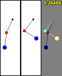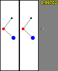 On the left is a crop of the left pendulum, the middle a crop of the right pedulum, and the right the two image subtracted (in RGB: Image1 - Image2 + 126 so as not to lose values less than 0) with AviSynth's RGBDifference printed at the top. With the given video the two pendulums don't always line up perfectly when they are in sync so there is some "noise" which you can see here.