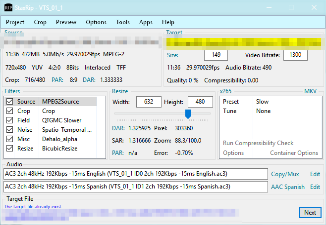 Code:Format : Matroska Format version : Version 4 / Version 2 File size : 149 MiB Duration : 35 min 17 s Overall bit rate : 591 kb/s Encoded date : UTC 2018-10-27 00:56:40 Writing application : mkvmerge v15.0.0 ('Duel with the Devil') 64-bit Writing library : libebml v1.3.5 + libmatroska v1.4.5 Writing frontend : StaxRip v1.7.0.0 Video ID : 1 Format : HEVC Format/Info : High Efficiency Video Coding Format profile : Main 10@L3@Main Codec ID : V_MPEGH/ISO/HEVC Duration : 11 min 36 s Bit rate : 1 301 kb/s Width : 632 pixels Height : 480 pixels Display aspect ratio : 4:3 Frame rate mode : Constant Frame rate : 29.970 (30000/1001) FPS Color space : YUV Chroma subsampling : 4:2:0 Bit depth : 10 bits Bits/(Pixel*Frame) : 0.143 Stream size : 108 MiB (72%) Writing library : x265 2.5+14-2718cb5dd67f:[Windows][GCC 7.1.0][64 bit] 10bit Encoding settings : cpuid=1173503 / frame-threads=2 / numa-pools=4 / wpp / no-pmode / no-pme / no-psnr / no-ssim / log-level=2 / input-csp=1 / input-res=632x480 / interlace=0 / total-frames=20873 / level-idc=0 / high-tier=1 / uhd-bd=0 / ref=4 / no-allow-non-conformance / no-repeat-headers / annexb / no-aud / no-hrd / info / hash=0 / no-temporal-layers / open-gop / min-keyint=25 / keyint=250 / bframes=4 / b-adapt=2 / b-pyramid / bframe-bias=0 / rc-lookahead=25 / lookahead-slices=0 / scenecut=40 / no-intra-refresh / ctu=64 / min-cu-size=8 / rect / no-amp / max-tu-size=32 / tu-inter-depth=1 / tu-intra-depth=1 / limit-tu=0 / rdoq-level=2 / dynamic-rd=0.00 / no-ssim-rd / signhide / no-tskip / nr-intra=0 / nr-inter=0 / no-constrained-intra / strong-intra-smoothing / max-merge=3 / limit-refs=3 / limit-modes / me=3 / subme=3 / merange=57 / temporal-mvp / weightp / no-weightb / no-analyze-src-pics / deblock=0:0 / sao / no-sao-non-deblock / rd=4 / no-early-skip / rskip / no-fast-intra / no-tskip-fast / no-cu-lossless / no-b-intra / no-splitrd-skip / rdpenalty=0 / psy-rd=2.00 / psy-rdoq=1.00 / no-rd-refine / analysis-reuse-mode=0 / no-lossless / cbqpoffs=0 / crqpoffs=0 / rc=abr / bitrate=1300 / qcomp=0.60 / qpstep=4 / stats-write=0 / stats-read=2 / cplxblur=20.0 / qblur=0.5 / ipratio=1.40 / pbratio=1.30 / aq-mode=1 / aq-strength=1.00 / cutree / zone-count=0 / no-strict-cbr / qg-size=32 / no-rc-grain / qpmax=69 / qpmin=0 / no-const-vbv / sar=0 / overscan=0 / videoformat=5 / range=0 / colorprim=2 / transfer=2 / colormatrix=2 / chromaloc=0 / display-window=0 / max-cll=0,0 / min-luma=0 / max-luma=1023 / log2-max-poc-lsb=8 / vui-timing-info / vui-hrd-info / slices=1 / opt-qp-pps / opt-ref-list-length-pps / no-multi-pass-opt-rps / scenecut-bias=0.05 / no-opt-cu-delta-qp / no-aq-motion / no-hdr / no-hdr-opt / no-dhdr10-opt / analysis-reuse-level=5 / scale-factor=0 / refine-intra=0 / refine-inter=0 / refine-mv=0 / no-limit-sao / ctu-info=0 Default : Yes Forced : No Audio #1 ID : 2 Format : AC-3 Format/Info : Audio Coding 3 Codec ID : A_AC3 Duration : 11 min 36 s Bit rate mode : Constant Bit rate : 192 kb/s Channel(s) : 2 channels Channel positions : Front: L R Sampling rate : 48.0 kHz Frame rate : 31.250 FPS (1536 SPF) Bit depth : 16 bits Compression mode : Lossy Stream size : 15.9 MiB (11%) Title : Dolby Digital English Language : English Service kind : Complete Main Default : Yes Forced : No Audio #2 ID : 3 Format : AAC Format/Info : Advanced Audio Codec Format profile : LC Codec ID : A_AAC-2 Duration : 11 min 36 s Bit rate : 110 kb/s Channel(s) : 2 channels Channel positions : Front: L R Sampling rate : 48.0 kHz Frame rate : 46.875 FPS (1024 SPF) Compression mode : Lossy Delay relative to video : 9 ms Stream size : 9.13 MiB (6%) Title : AAC Spanish Language : Spanish Default : No Forced : No Audio #3 ID : 4 Format : AC-3 Format/Info : Audio Coding 3 Codec ID : A_AC3 Duration : 11 min 36 s Bit rate mode : Constant Bit rate : 192 kb/s Channel(s) : 2 channels Channel positions : Front: L R Sampling rate : 48.0 kHz Frame rate : 31.250 FPS (1536 SPF) Bit depth : 16 bits Compression mode : Lossy Stream size : 15.9 MiB (11%) Title : Audio Commentary' Service kind : Complete Main Default : No Forced : No Text ID : 5 Format : UTF-8 Codec ID : S_TEXT/UTF8 Codec ID/Info : UTF-8 Plain Text Duration : 11 min 22 s Bit rate : 71 b/s Count of elements : 296 Stream size : 5.92 KiB (0%) Title : Closed Captions Language : English Default : No Forced : No