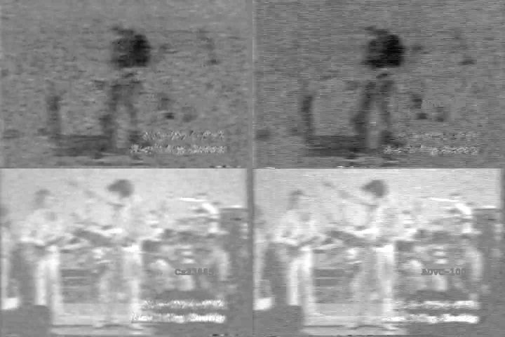 On the left is the Cx23885 cap, the right the ADVC100 cap. On the top is the U channel, the bottom the V channel, both contrast stretched to make the differences more obvious. In the CX cap you can see individual letters in the word "Daddy". In the ADVC cap they have blurred together. There's also lots of block and line artifacts in the latter. -