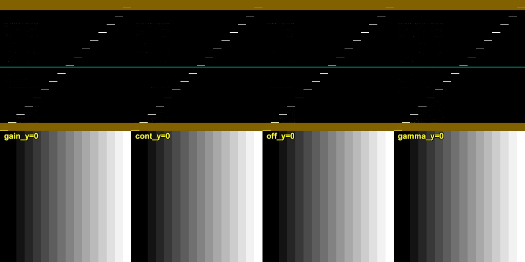 At frame 50 is the untouched video. Frame numbers lower than that show the result of negative values to ColorYUV. Higher frames numbers show the result of positive values.Code:########################################################################## function GreyRamp() { black = BlankClip(color=$000000, length=256, width=1, height=256, pixel_type="RGB32") white = BlankClip(color=$010101, length=256, width=1, height=256, pixel_type="RGB32") StackHorizontal(black,white) StackHorizontal(last, last.RGBAdjust(rb=2, gb=2, bb=2)) StackHorizontal(last, last.RGBAdjust(rb=4, gb=4, bb=4)) StackHorizontal(last, last.RGBAdjust(rb=8, gb=8, bb=8)) StackHorizontal(last, last.RGBAdjust(rb=16, gb=16, bb=16)) StackHorizontal(last, last.RGBAdjust(rb=32, gb=32, bb=32)) StackHorizontal(last, last.RGBAdjust(rb=64, gb=64, bb=64)) StackHorizontal(last, last.RGBAdjust(rb=128, gb=128, bb=128)) } ########################################################################## function _VaryColorYUV(clip v, string property, int value) { (property == "cont_y") ? ColorYUV(v, cont_y=value) : v (property == "cont_u") ? ColorYUV(v, cont_u=value) : last (property == "cont_v") ? ColorYUV(v, cont_v=value) : last (property == "gain_y") ? ColorYUV(v, gain_y=value) : last (property == "gain_u") ? ColorYUV(v, gain_u=value) : last (property == "gain_v") ? ColorYUV(v, gain_v=value) : last (property == "off_y") ? ColorYUV(v, off_y=value) : last (property == "off_u") ? ColorYUV(v, off_u=value) : last (property == "off_v") ? ColorYUV(v, off_v=value) : last (property == "gamma_y") ? ColorYUV(v, gamma_y=value) : last # gamma_u not supported # gamma_v not supported Subtitle(property+"="+string(value)) #show property and value used } function VaryColorYUV(clip v, int "frame_num", int "num_frames", string "property", int "start_val", int "end_val") { Trim(v, frame_num,frame_num) Loop(num_frames, 0, 0) Animate(0,num_frames, "_VaryColorYUV", last,property,start_val, last,property,end_val) } ########################################################################## GreyRamp() PointResize(16,height).PointResize(width,height) ConvertToYV12(matrix="PC.601") v1 = VaryColorYUV(last, 1, 100, "gain_y", -256, 256) v2 = VaryColorYUV(last, 1, 100, "cont_y", -256, 256) v3 = VaryColorYUV(last, 1, 100, "off_y", -256, 256) v4 = VaryColorYUV(last, 1, 100, "gamma_y", -256, 256) StackHorizontal(V1,v2,v3,v4) TurnRight().Histogram().TurnLeft()