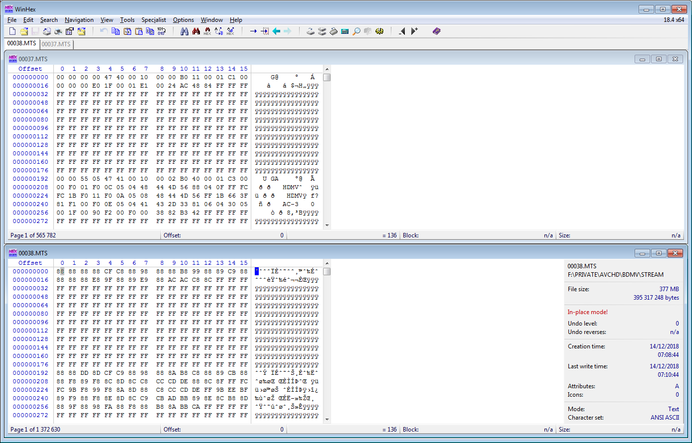 Here file 00037.MTS is correct and readable, whereas 00038.MTS is unreadable, and you can see that everything except the “FF” is shifted by “88” in hexadecimal. All the unreadable files have the same pattern.