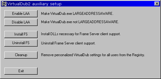 4. You could enable LAA and therefore make 32 bit VDub use up to 4GB of memory on a 64 bit OS. Run "auxsetup.exe" in the 'extra' directory and select 'Enable LAA'.