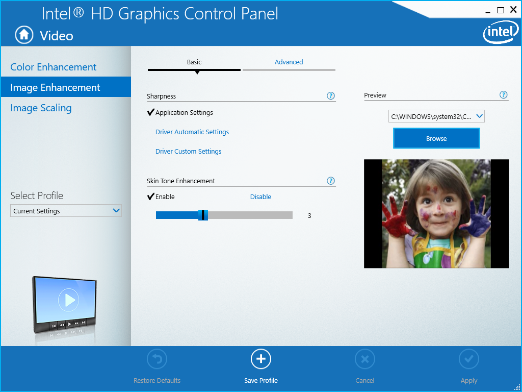 When I right-click on my computer and click on "Graphics Properties", this control panel menu shows up. It says "Intel HD Graphics Control Panel". I'm assuming this is the graphics card setup applet you're talking about? Unfortunately, I wasn't able to locate any of the options you mentioned. Maybe a little more help will steer me in the right direction.