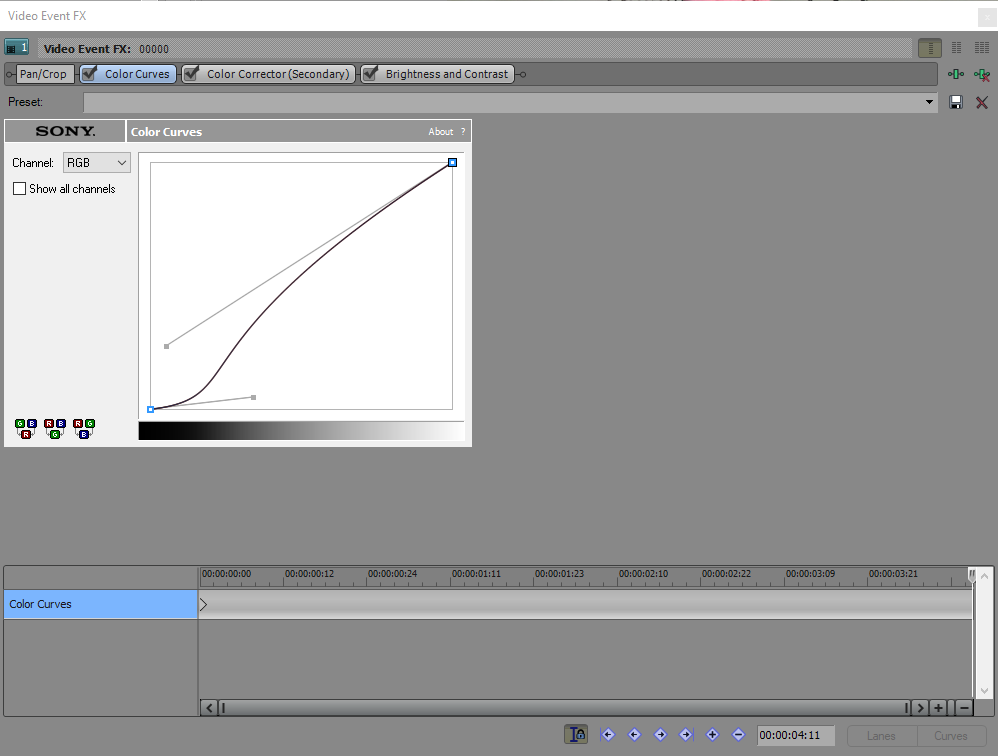 These are the Sony Vegas FX settings that I usually use. I try to keep things simple. The only thing I modify is the color curves, saturation, levels, and contrast. That's about it.
