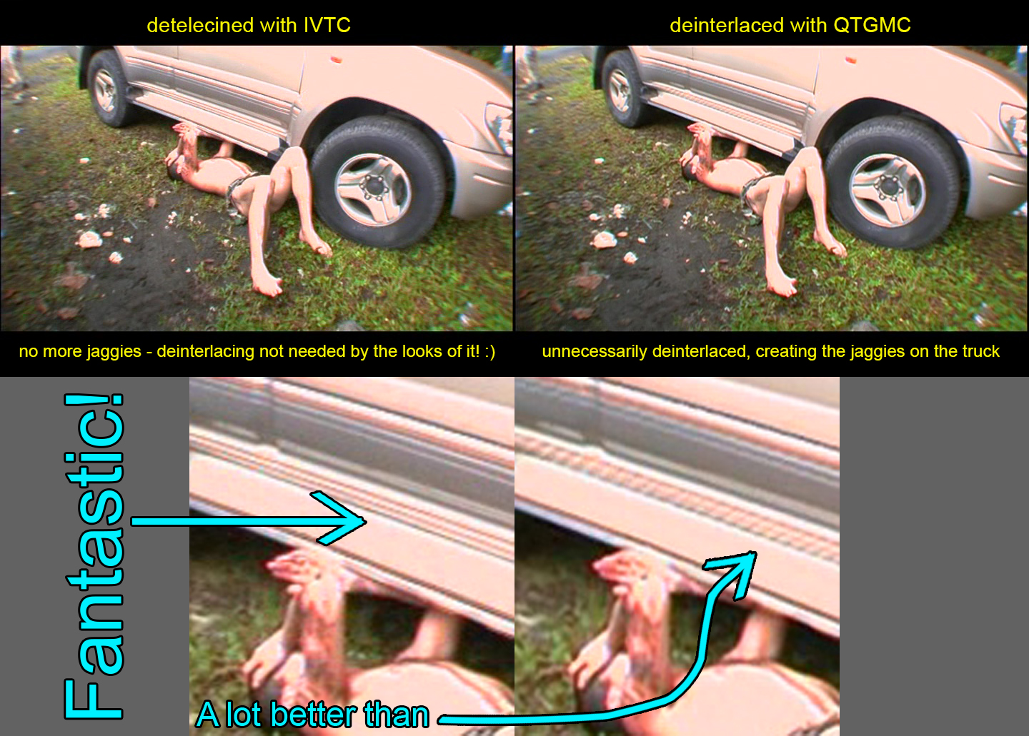I'm very new here, and also pretty new to the world of deinterlacing. For a couple of years now, I have been trying to correctly deinterlace some DVD footage that has been the most difficult thing to figure out ever, out of all of my DVDs. When I first started, I used Wondershare software to simply cut each clip I wanted to extract, and it would deinterlace automatically, BUT would make the video laggy (repeated frames). Then a while later, I came back to the project, and found out how to stream VLC deinterlaced footage (using VLC's range of different deinterlace options) to file. Which gave much better results! BUT far from perfect. I've always wondered if there was maybe a combo of Telecine & Interlace happening..... but after recent tests, I think it is just Interlace that I need to find out how to deinterlace properly. So recently, after such a long time not playing with it (because it is so frustrating), I found a deinterlacer called QTGMC. Looks very complicated, but I found that StaxRip has this plugin built into its GUI. So yesterday I got back into trying to deinterlace my DVD footage. Just a moment though - for your information - the DVD I used originally a couple of years ago was a PAL DVD. I bought a collection of the same series but in NTSC last year, and did a side-by-side comparison to see which had a better image quality (pre-deinterlace and post-deinterlace), and the NTSC did indeed look better overall, even with a few less pixels (being NTSC). The NTSC version also gave me slightly better results when using that VLC deinterlace trick - but still problematic as it either gave me lag on some options, or remaining interlace/telecine lines on other options. So I gave up for a while. Anyway, back to yesterdays QTGMC! QTGMC via StaxRip has given me the BEST result yet, and i'm very happy about that (as I remember having really poor quality using handbrake a year ago or so, as a test, as I wanted to see how other deinterlacers worked).